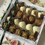 Клубника свежая Состав: какао-масло, тертое какао, сухое цельное молоко, сахар, натуральные лецитин и ваниль Посыпка и допики: перемолотая фисташка, хрустящая посыпка, с добавлением инжира и шоколада