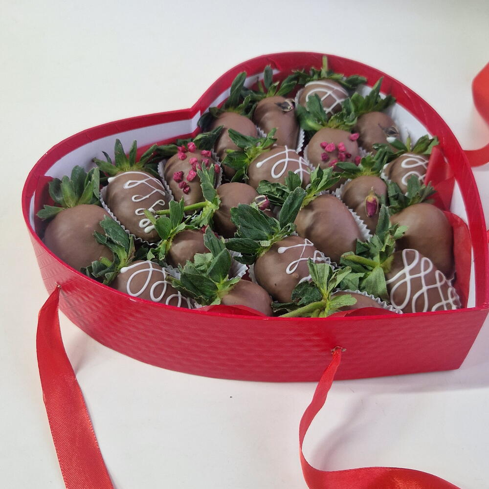 Состав: клубника свежая импортная, шоколад молочный бельгийский, какао тертое, какао масло, сухое молоко, посыпки сахарные. Используется исключительно качественный бельгийский шоколад.