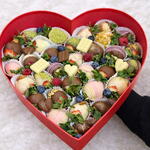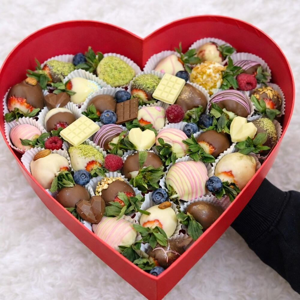 1. Клубника свежая 2. Голубика свежая 3. Малина свежая 4. Шоколад: - Белый шоколад: Сахар, сухое цельное молоко, какао-масло, эмульгатор (лецитин), натуральный ванилин. • Молочный шоколад: Сахар, какао-масло, какао тертое, сухое молоко, сухая сыворотка, эмульгатор (лецитин), ванилин. 5. Посыпка: - Вафельная крошка - Дробленый арахис - Фисташка дробленая