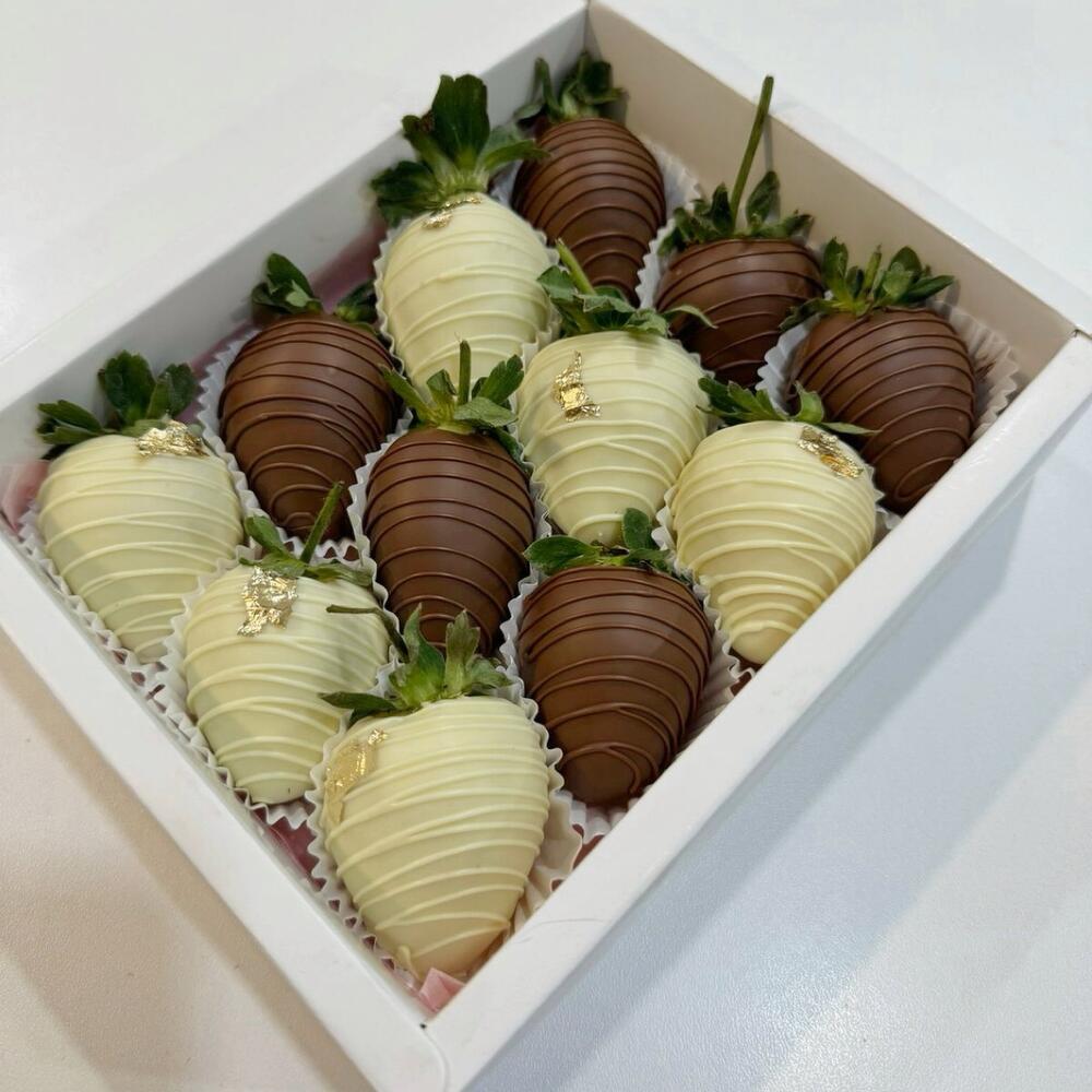 Свежая клубника, шоколад белый (сахар; масло какао; сухое цельное молоко; сухое обезжиренное молоко; молочный жир; эмульгатор лецитин соевый; натуральный ароматизатор: ваниль), сублимированная клубника, сублимированная черная смородина, сублимированная малина, хрустящие шарики из белого шоколада, пищевое золото.