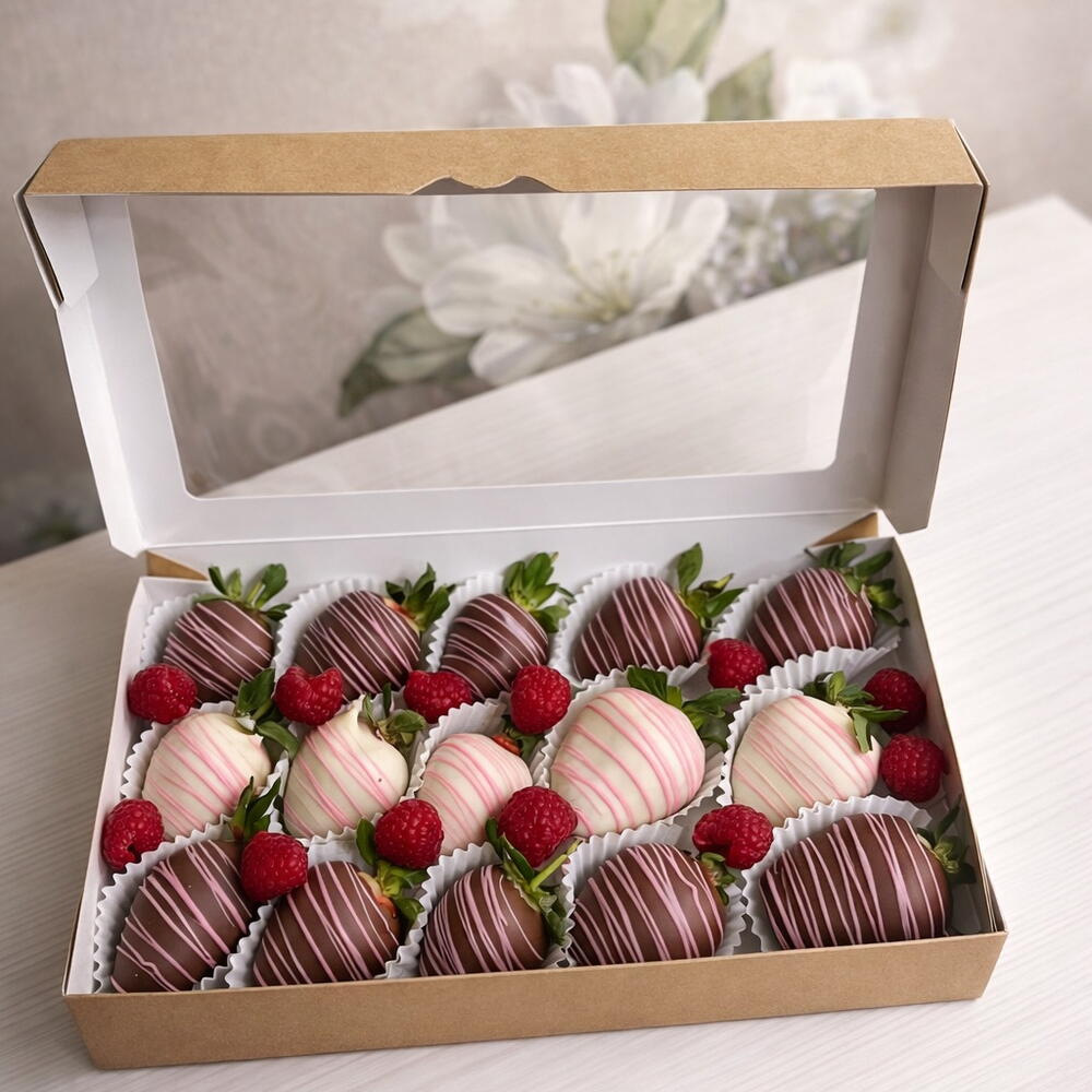 1. Клубника свежая 2. Малина свежая 3. Шоколад: - Белый шоколад: Сахар, сухое цельное молоко, какао-масло, эмульгатор (лецитин), натуральный ванилин. • Молочный шоколад: Сахар, какао-масло, какао тертое, сухое молоко, сухая сыворотка, эмульгатор (лецитин), ванилин.