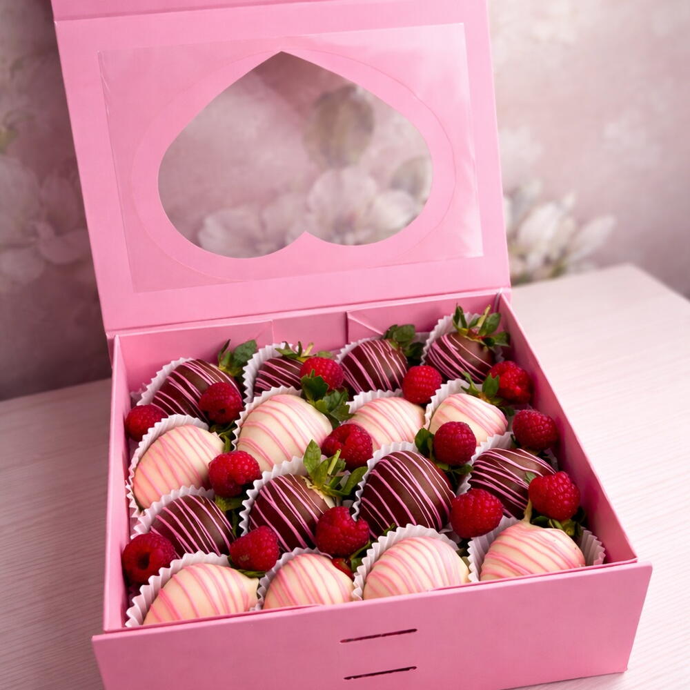1. Клубника свежая 2. Малина свежая 3. Шоколад: - Белый шоколад: Сахар, сухое цельное молоко, какао-масло, эмульгатор (лецитин), натуральный ванилин. • Молочный шоколад: Сахар, какао-масло, какао тертое, сухое молоко, сухая сыворотка, эмульгатор (лецитин), ванилин.