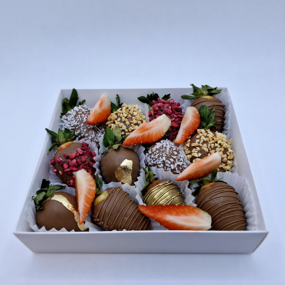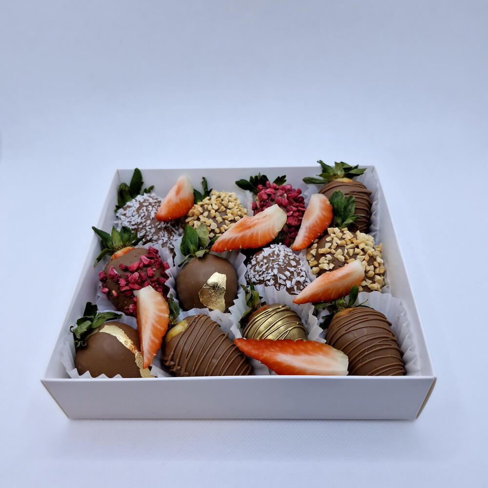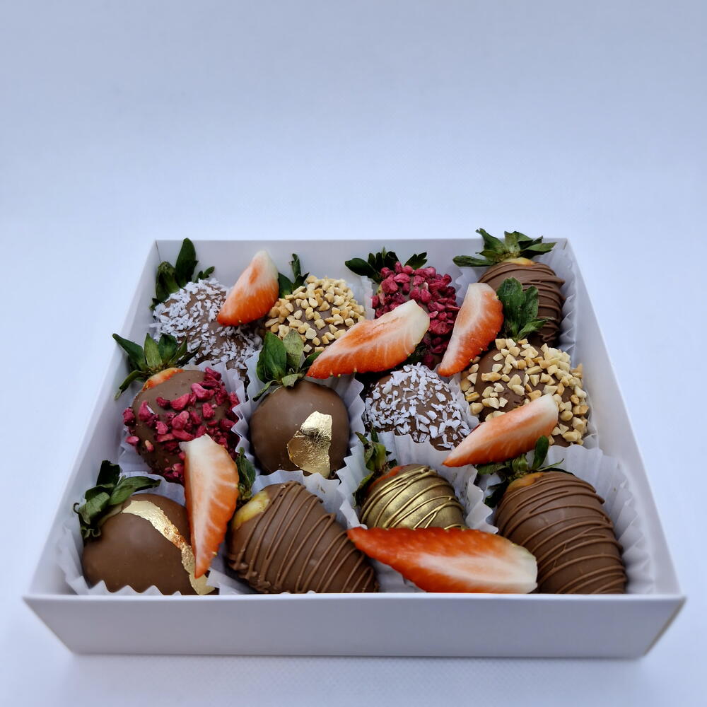 Элегантный набор из свежей клубники в бельгийском молочном шоколаде с разнообразными посыпками и декором. В наборе — классическая глазурь, кокосовая стружка, дроблёные орехи, сублимированная малина и шоколадный декор. Идеальный вариант для подарка, угощения к празднику или сладкого комплимента.
