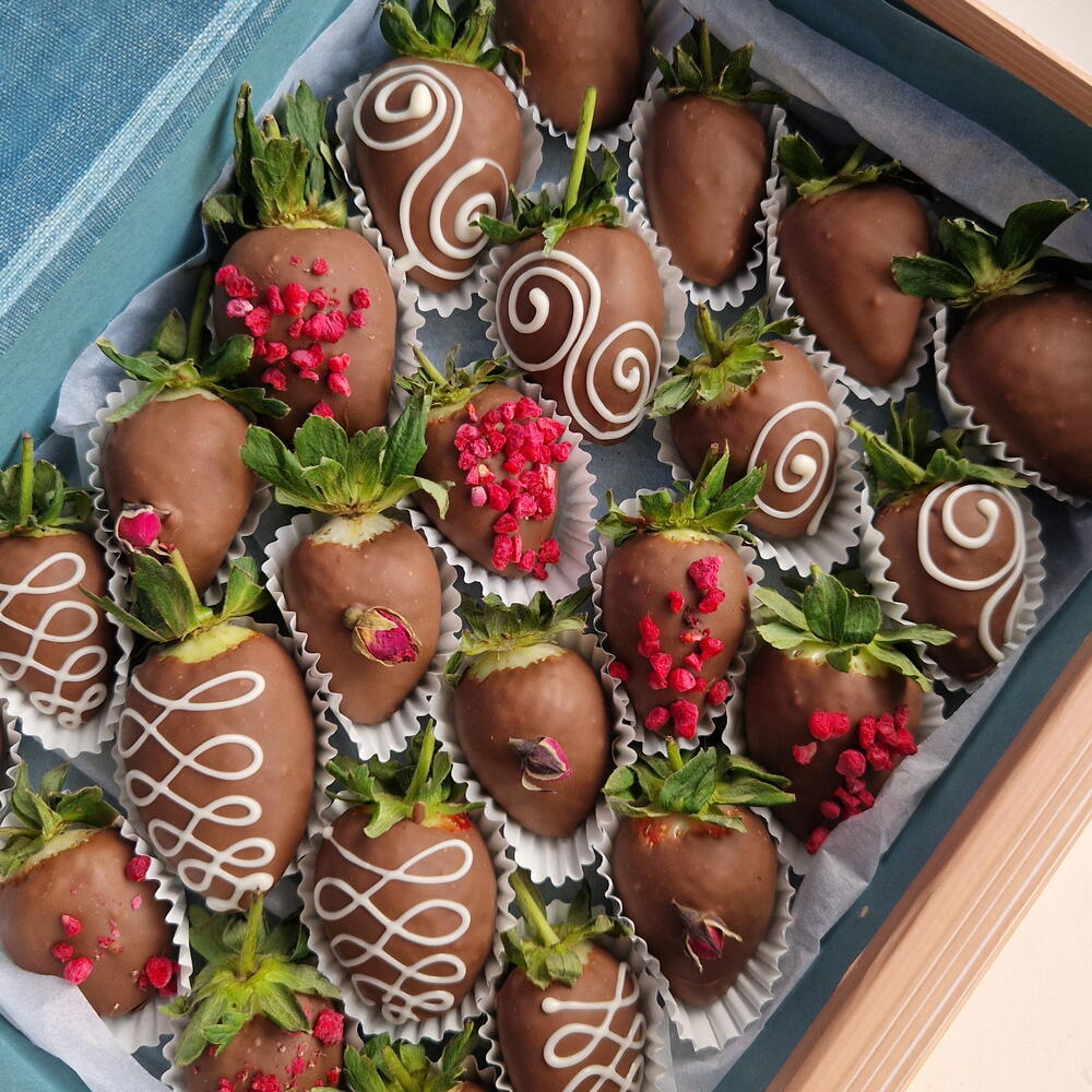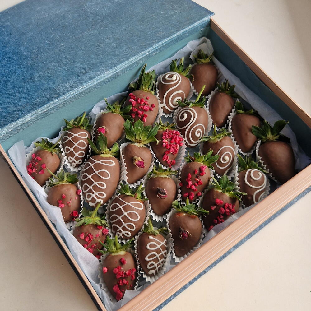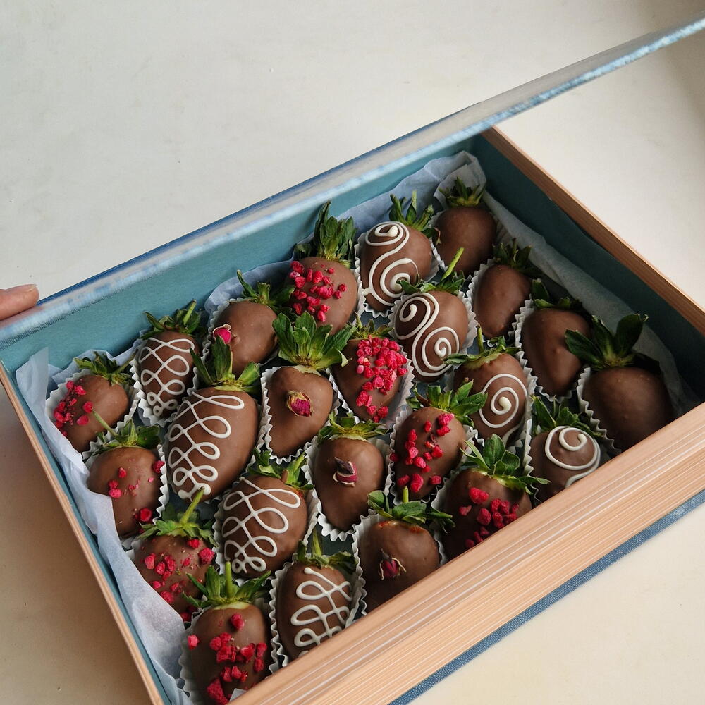 Для своих коробок мы покупаем самую лучшую клубнику и самый лучший шоколад. Никакой глазури. Используется исключительно качественный бельгийский шоколад. Хранить в холодильнике не более 24 часов. Перед употреблением оставить при комнатной температуре на 15 минут. В количестве 24 шт. Отличный подарок для мамы или девушки.