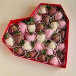 Состав: клубника свежая импортная, шоколад белый и молочный бельгийский, какао тертое, какао масло, сухое молоко, посыпки сахарные.