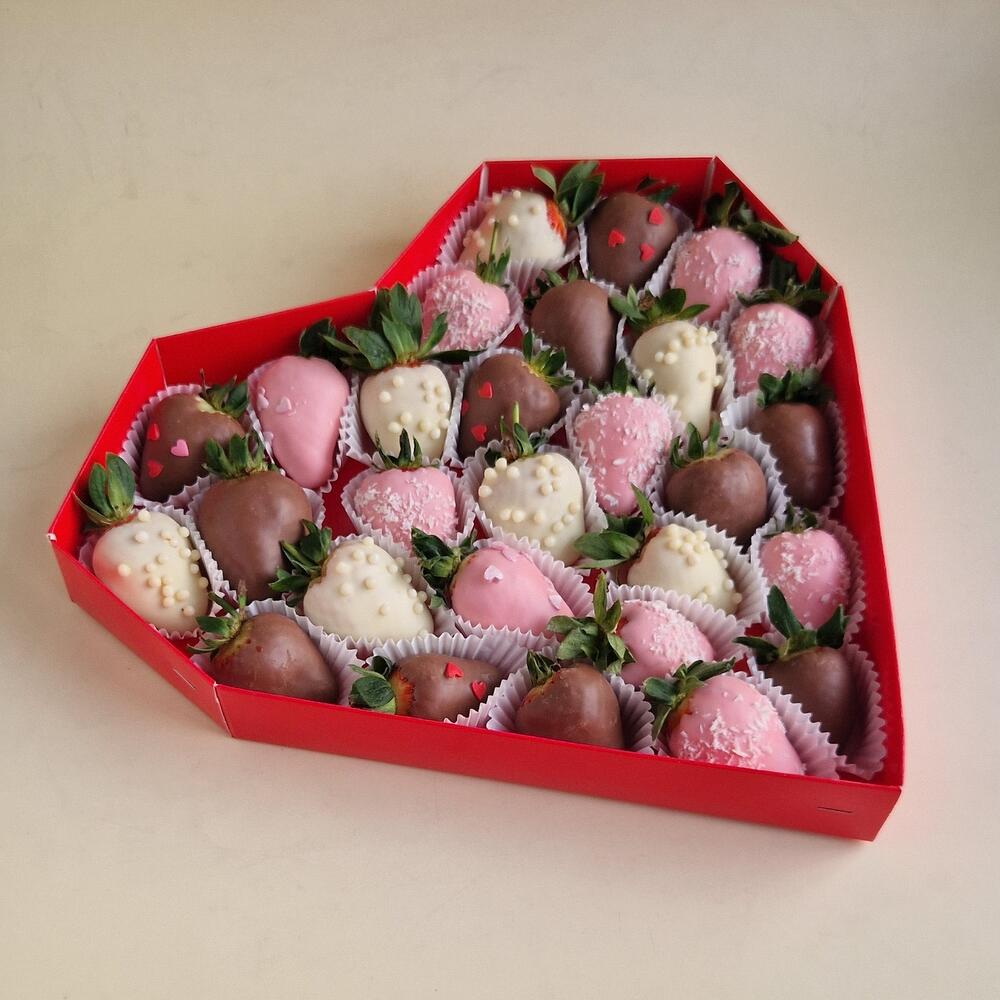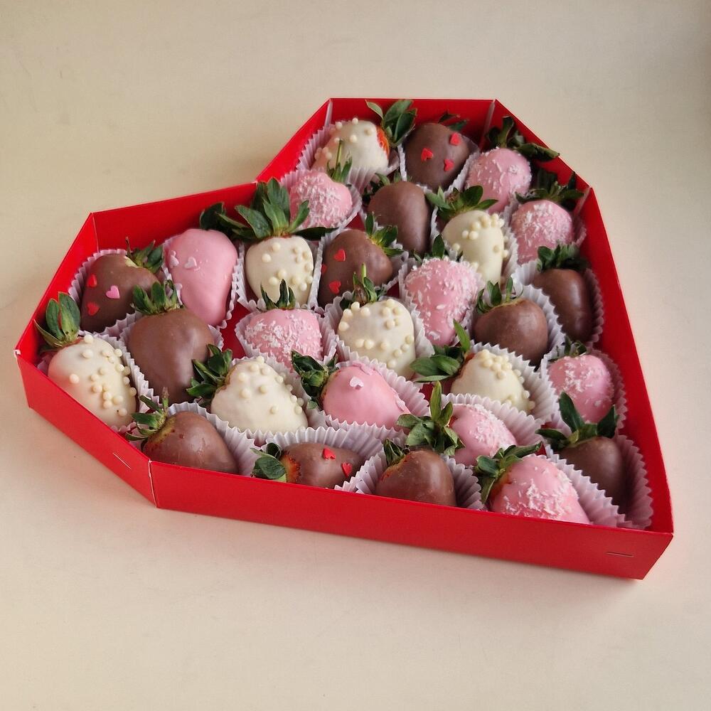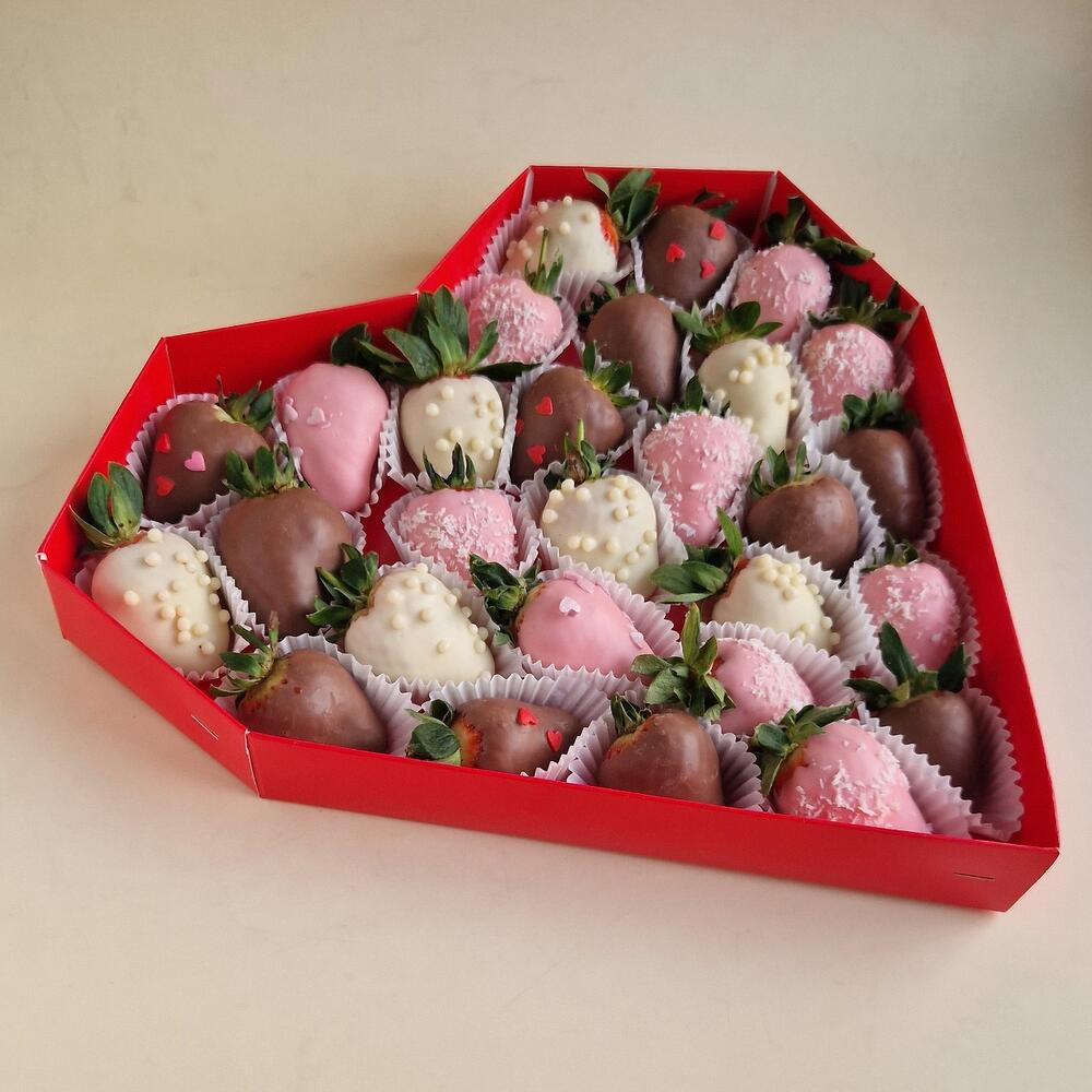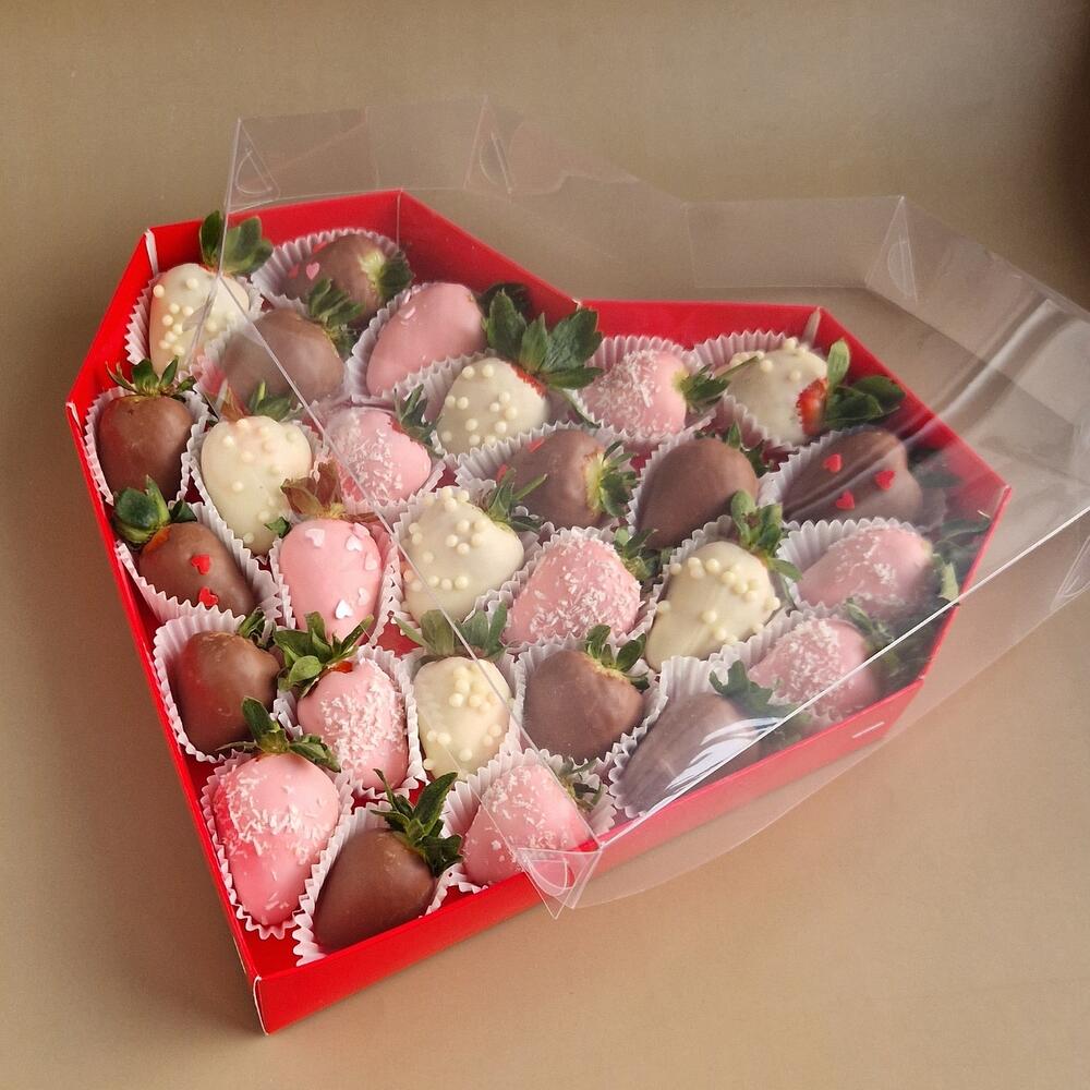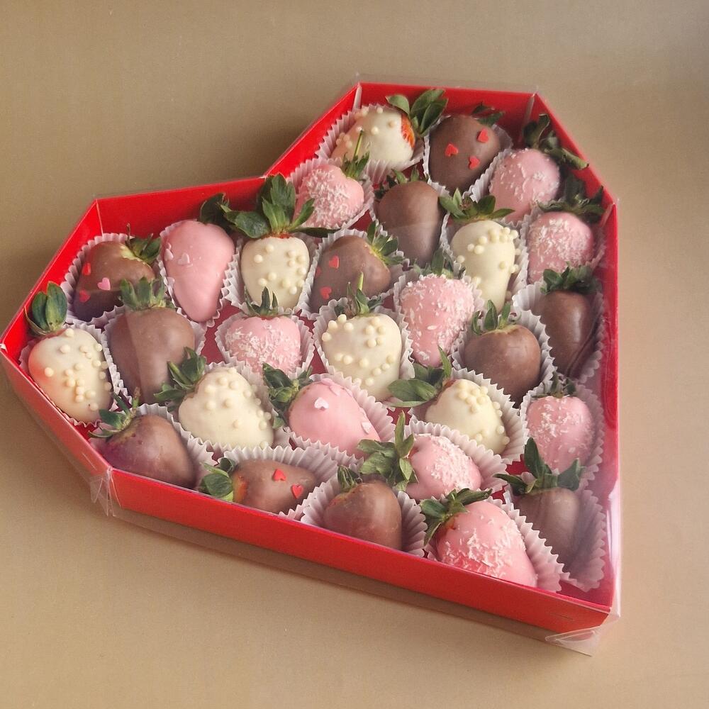 Состав: клубника свежая импортная, шоколад белый и молочный бельгийский, какао тертое, какао масло, сухое молоко, посыпки сахарные.