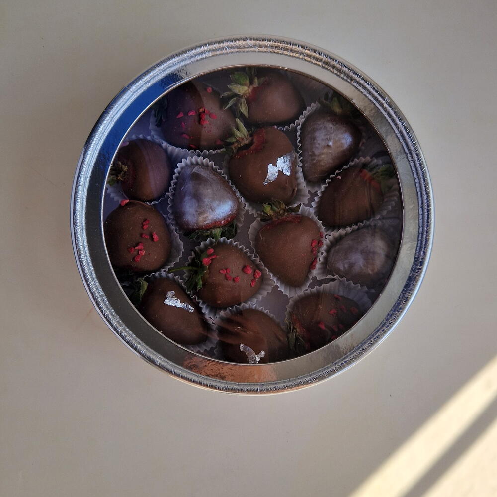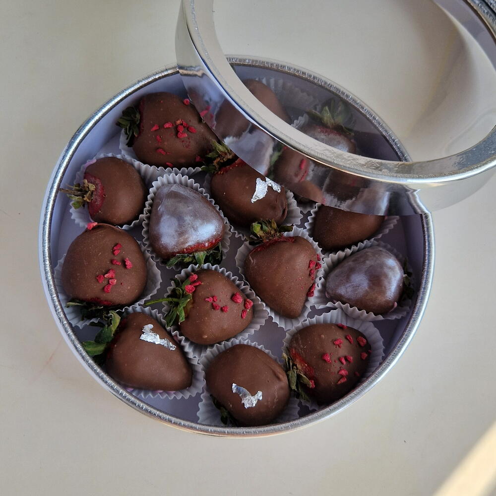 Состав: клубника свежая импортная, шоколад белый и молочный бельгийский, какао тертое, какао масло, сухое молоко, посыпки сублемированной малины, пищевой серебряный кондурин, пищевое серебряное золото. Используется исключительно качественный бельгийский шоколад.