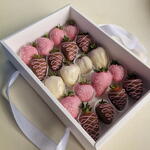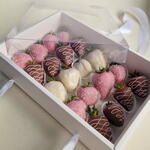 Состав: клубника свежая импортная, шоколад белый и молочный бельгийский, какао тертое, какао масло, сухое молоко, посыпки сахарные.
