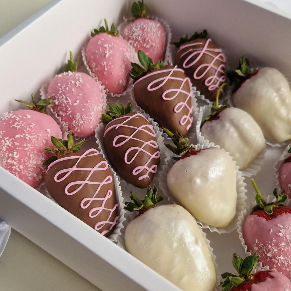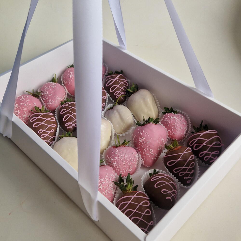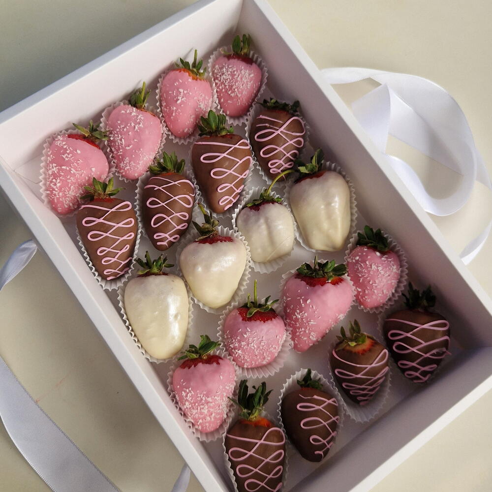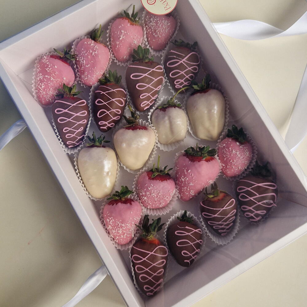 Состав: клубника свежая импортная, шоколад белый и молочный бельгийский, какао тертое, какао масло, сухое молоко, посыпки сахарные.
