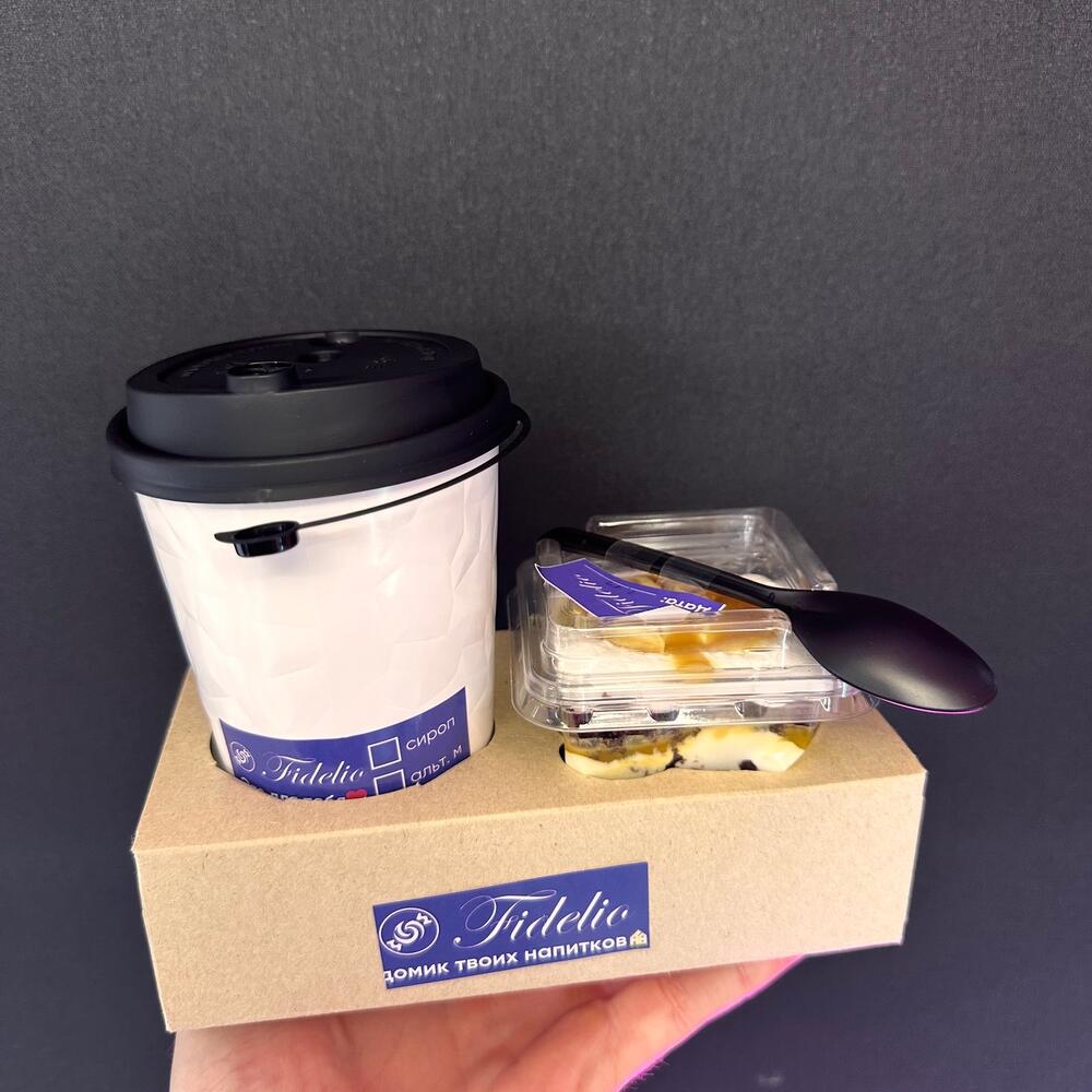 Наш фирменный трайфл и кокосовый раф — идеальное комбо для сладкого наслаждения. Трайфл — легкий и воздушный десерт, собранный слоями бисквита, крема и сочных фруктов, создающий гармоничное сочетание вкусов и текстур. Кокосовый раф — нежный кофейный напиток с тонкими нотками кокоса, обволакивающий и согревающий. Оба подаются в удобной и практичной упаковке, чтобы вы могли насладиться ими где угодно.