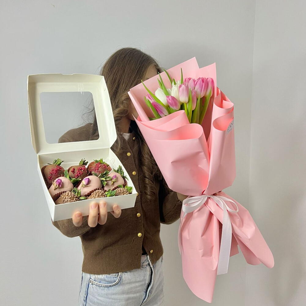 Комбо с тюльпанами и клубникой в шоколаде