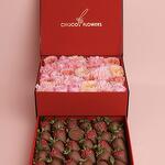 Состав цветы Pink Expression 7 шт Диантус 5 шт Кустовые Розы 4 шт Озатамус 1 Состав клубники: 25-30 шт в Бельгийском молочном шоколаде (посыпка Сублимированная малина )