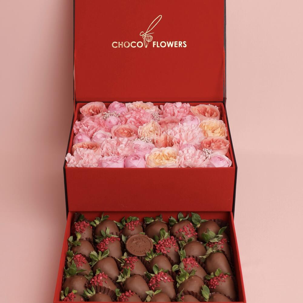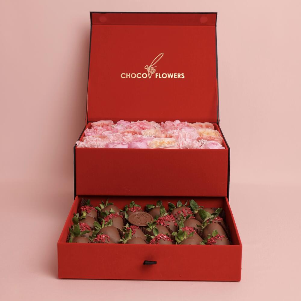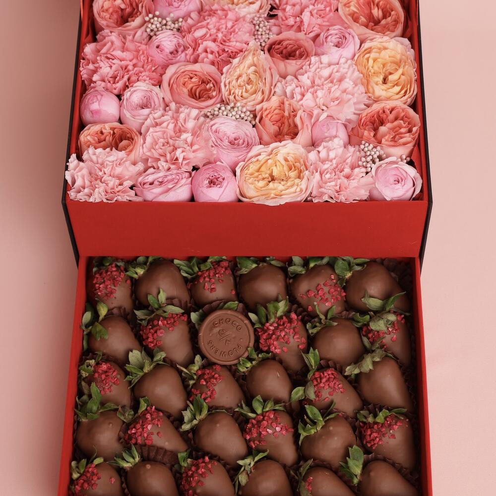 Состав цветы Pink Expression 7 шт Диантус 5 шт Кустовые Розы 4 шт Озатамус 1 Состав клубники: 25-30 шт в Бельгийском молочном шоколаде (посыпка Сублимированная малина )