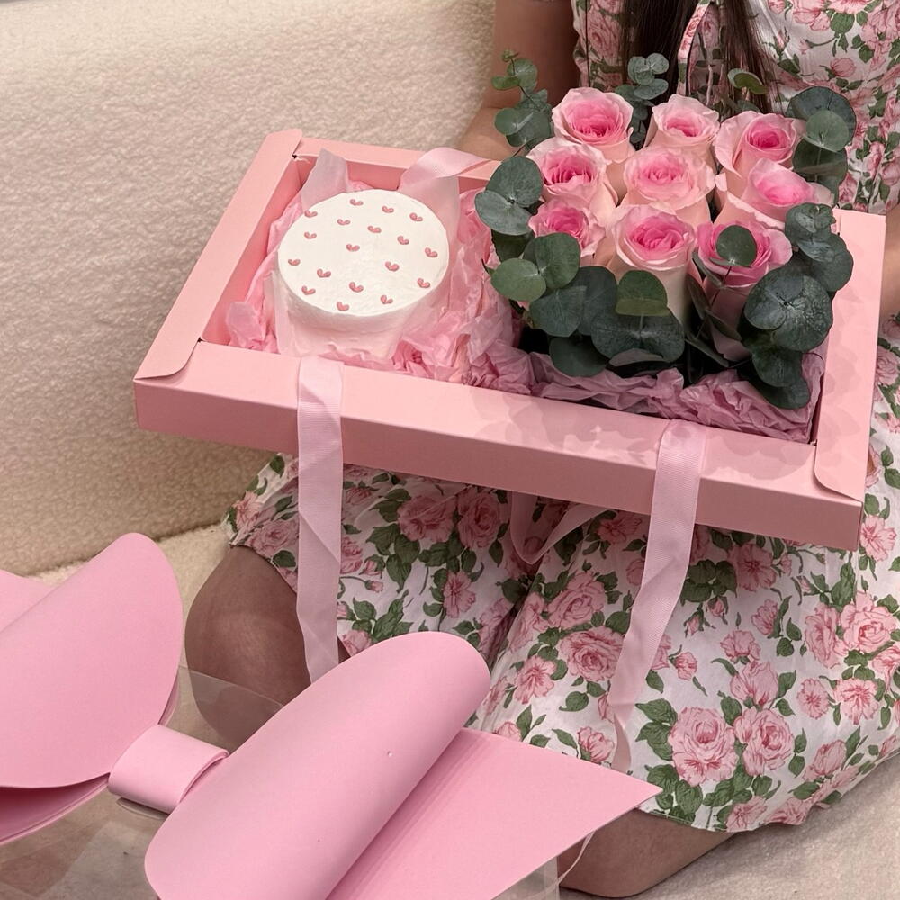 Красивая комбо коробка с цветами и бенто тортом