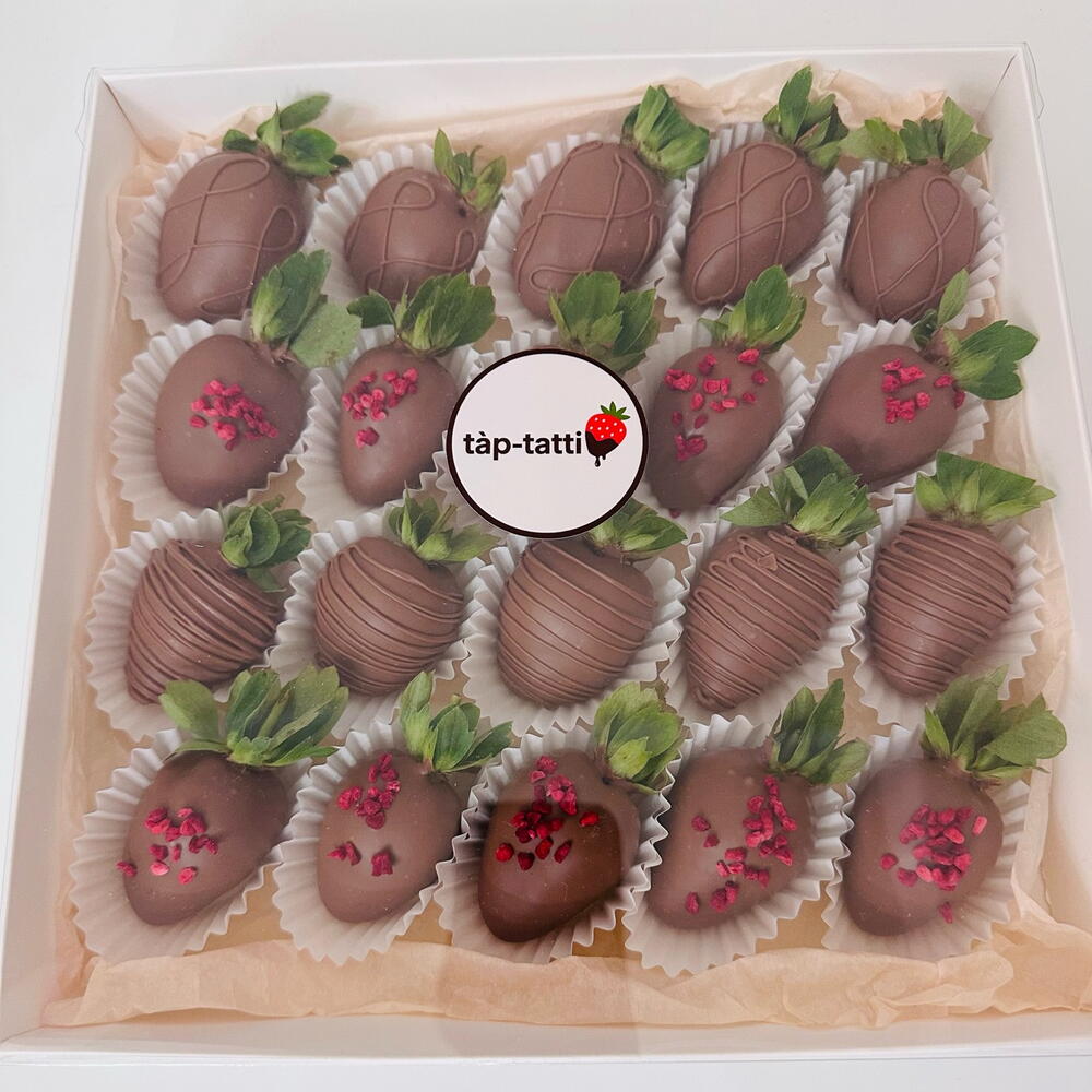 • Свежая отборная клубника 20штук • Молочный шоколад Callebaut • Состав шоколада: сахар, какао-масло, сухое цельное молоко, какао тертое, эмульгатор (соевый лецитин), натуральный ароматизатор (ваниль).