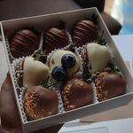 Клубника свежая Состав: какао-масло, тертое какао, сухое цельное молоко, сахар, натуральные лецитин и ваниль, Посыпки: с добавлением голубики и малины