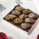 Королевские финики начиненные грецким орехом, покрытые молочным бельгийским шоколадом. Сверху покрыты кокосовой стружкой, ореховой крошкой , долькой апельсиновых чипс.