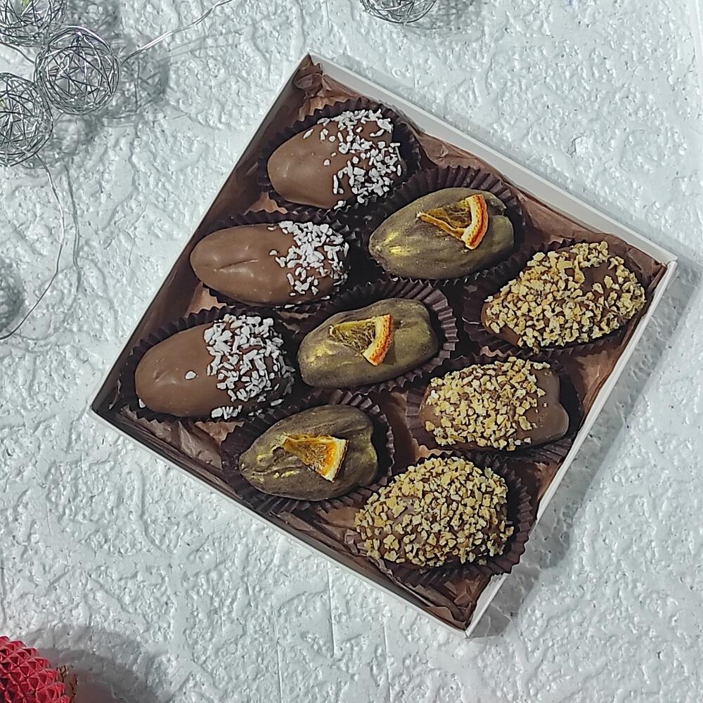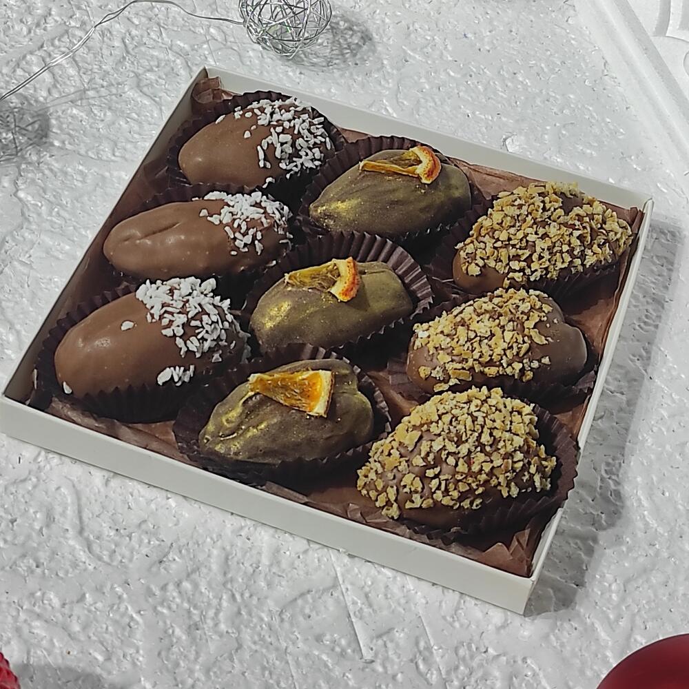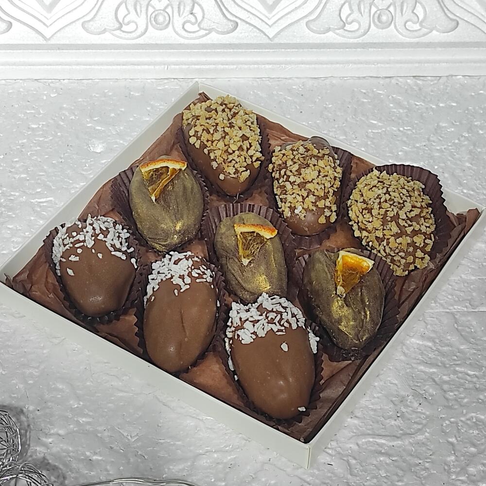Королевские финики начиненные грецким орехом, покрытые молочным бельгийским шоколадом. Сверху покрыты кокосовой стружкой, ореховой крошкой , долькой апельсиновых чипс.