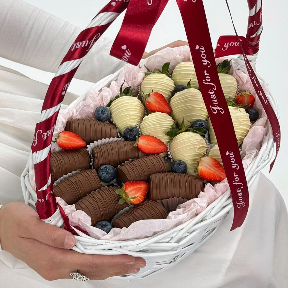 Эффектная фруктовая корзина с белой клубникой, бананами в шоколаде и свежей голубикой. Это не просто десерт — это удовольствие в плетёной форме. Подходит для подарка, корпоратива или сладкого вечера с близкими.