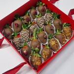 Состав: клубника свежая импортная, шоколад молочный бельгийский, какао тертое, какао масло, сухое молоко, посыпки сахарные, сублимированная малина, сублисированные цветы, вафельная крошка.