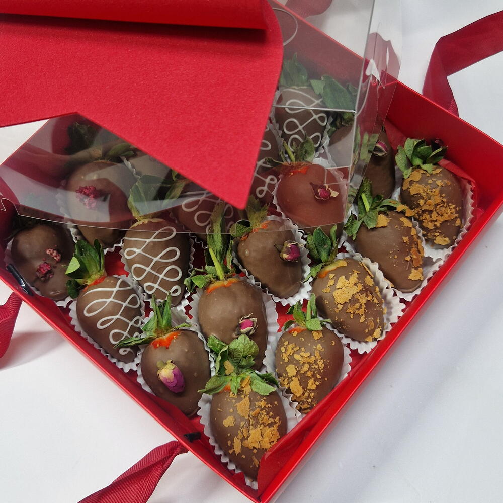 Состав: клубника свежая импортная, шоколад молочный бельгийский, какао тертое, какао масло, сухое молоко, посыпки сахарные, сублимированная малина, сублисированные цветы, вафельная крошка.