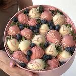 Свежая клубника, покрытая белым и розовым шоколадом, 100 грамм свежей голубики. Состав шоколада: какао-бобы, какао-масло, сахар, молоко, лецитин, ароматизаторы.