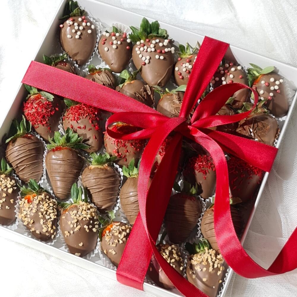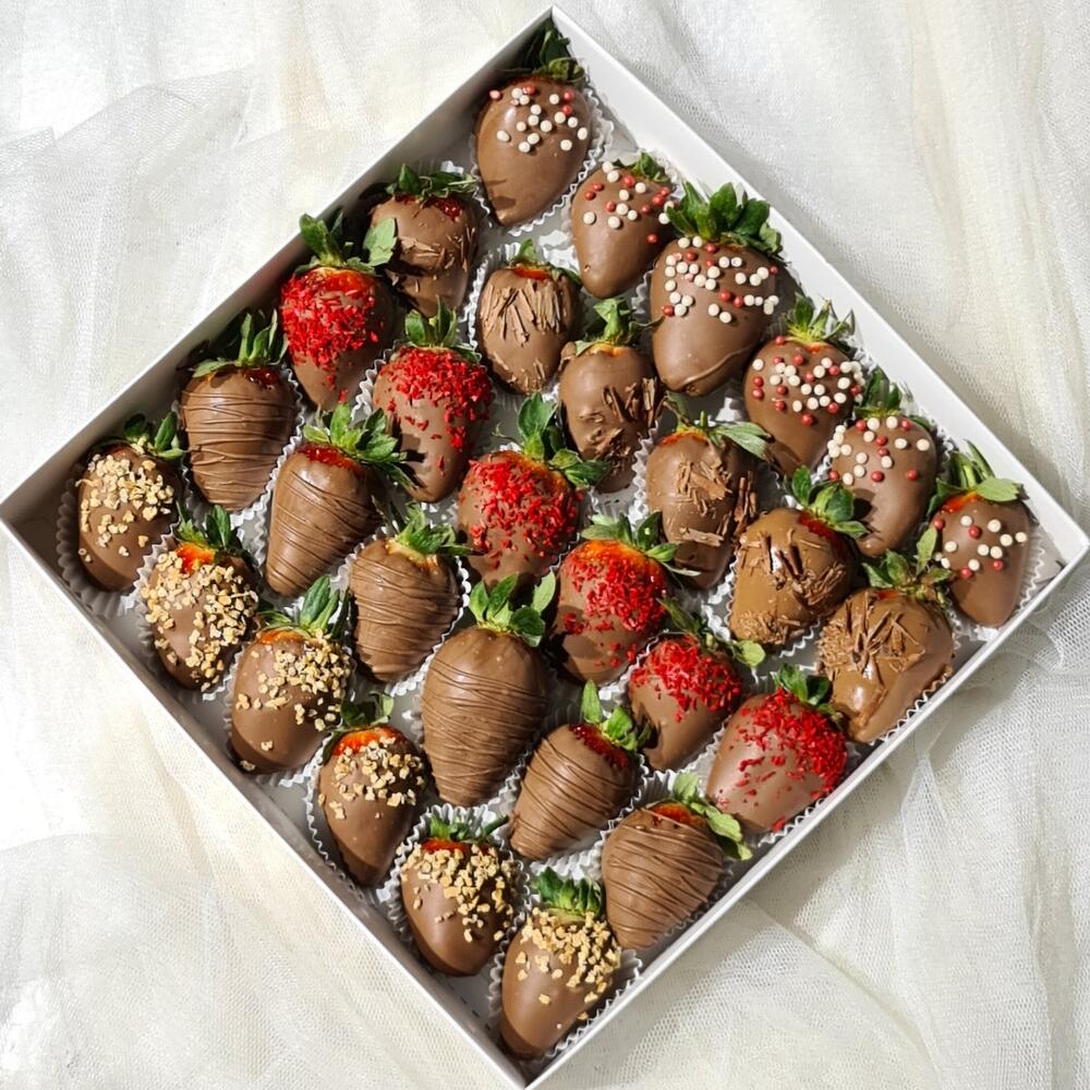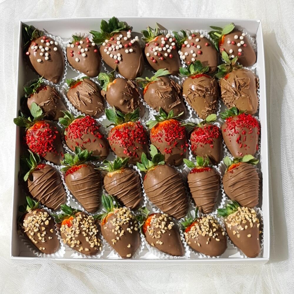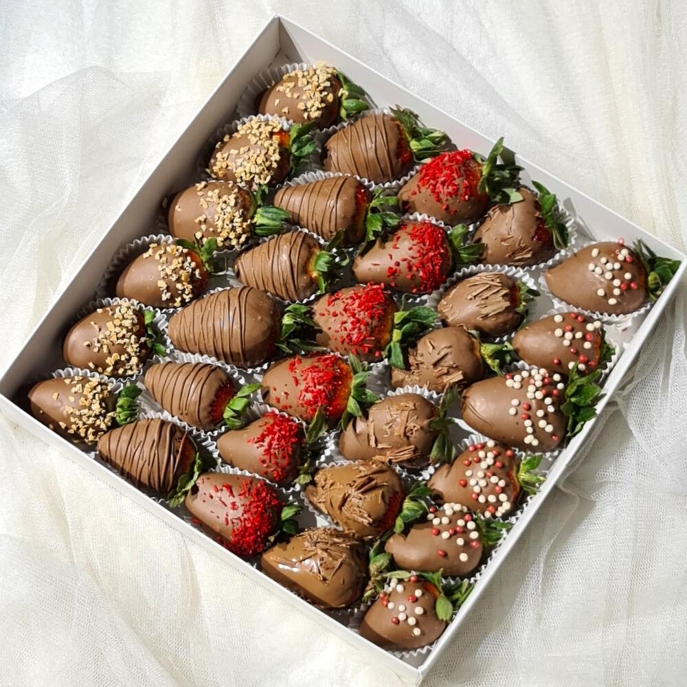 Клубника в молочном бельгийском шоколаде, украшенная кокосовой стружкой, воздушным рисом, шоколадной стружкой, вафельной крошкой. В наборе 30шт.