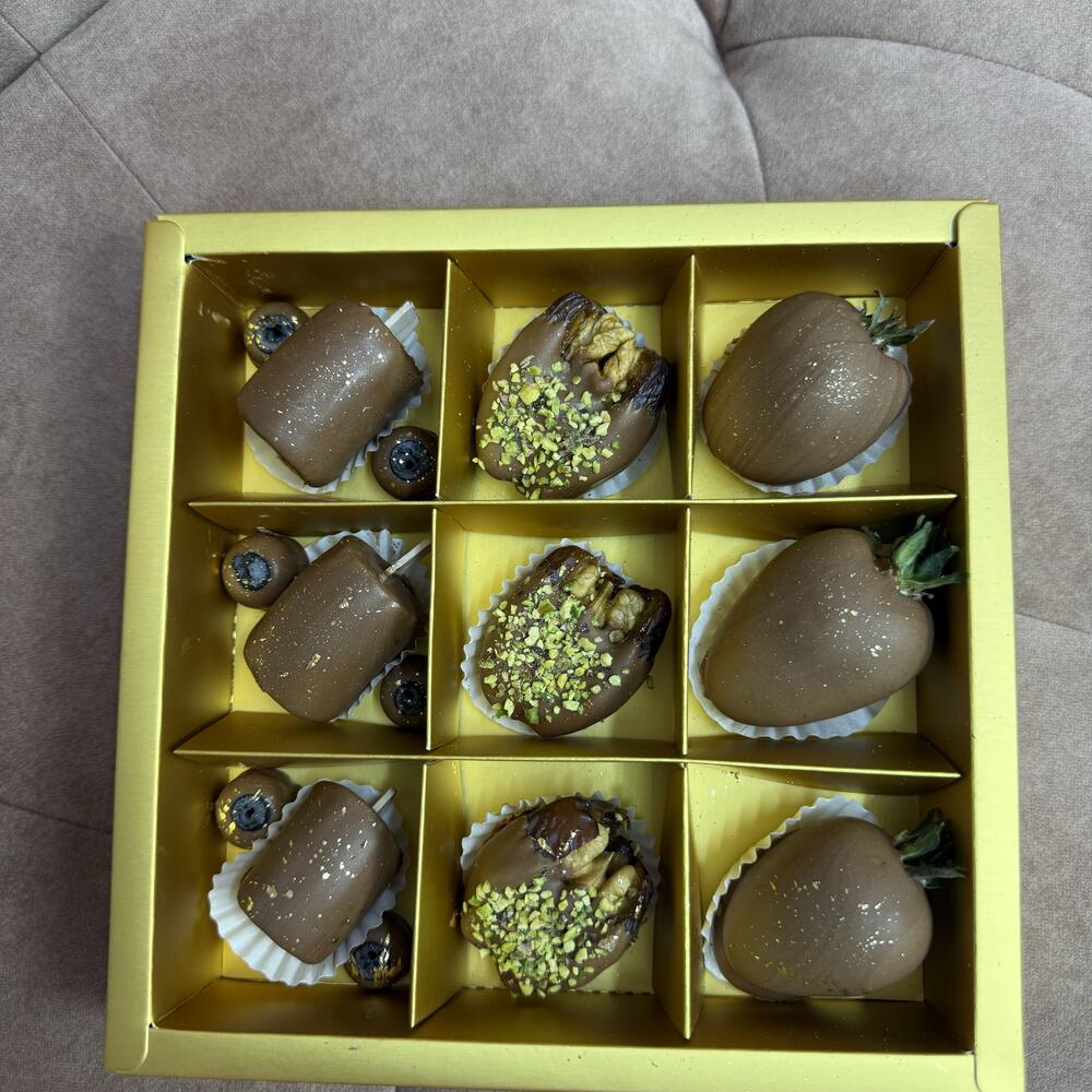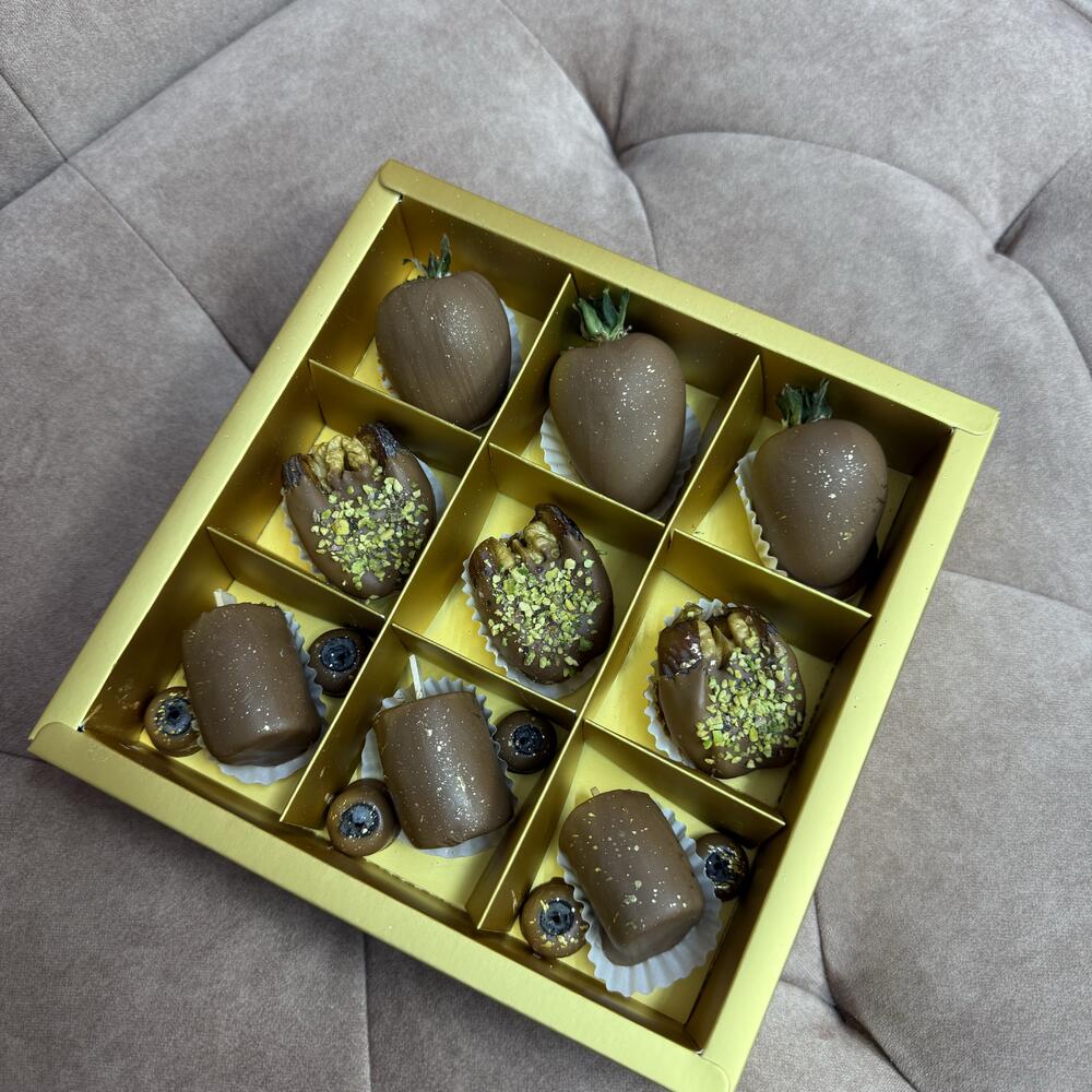 Бокс микс 3: клубника в молочном шоколаде, банан в молочном шоколаде, финики в молочном шоколаде с начинкой из Орехов.