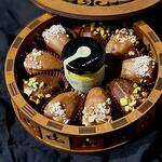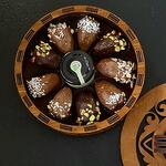 Финики в бельгийском шоколаде с грецким орехом внутри, сверху украшены дробленой фисташкой, миндалём и кокосовой стружкой. Центр украшает мёд-суфле .