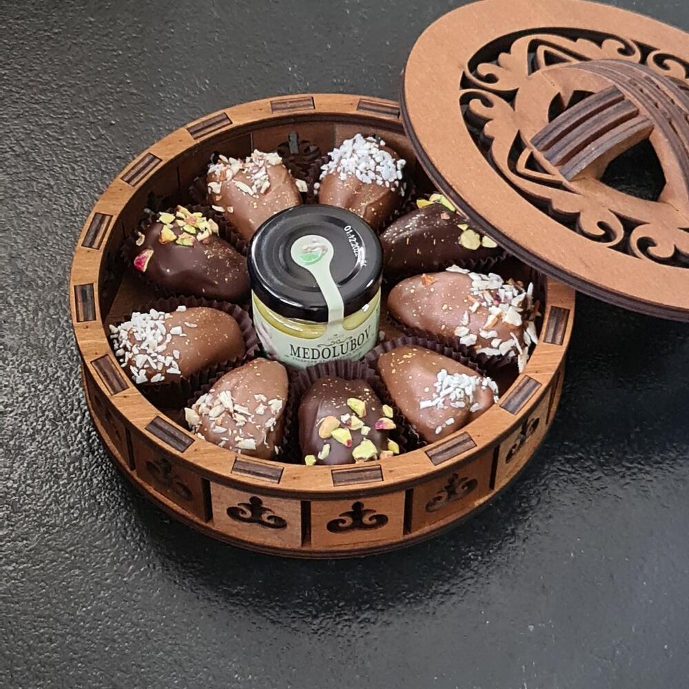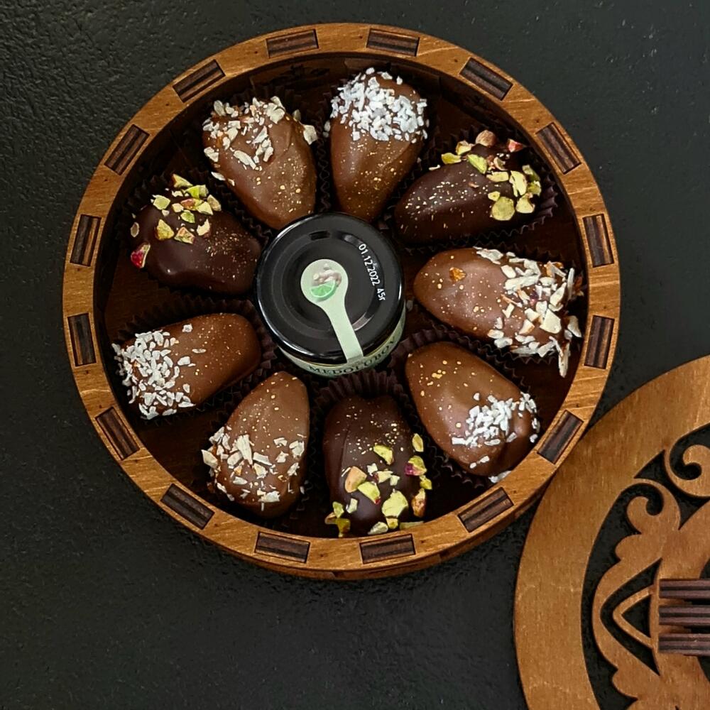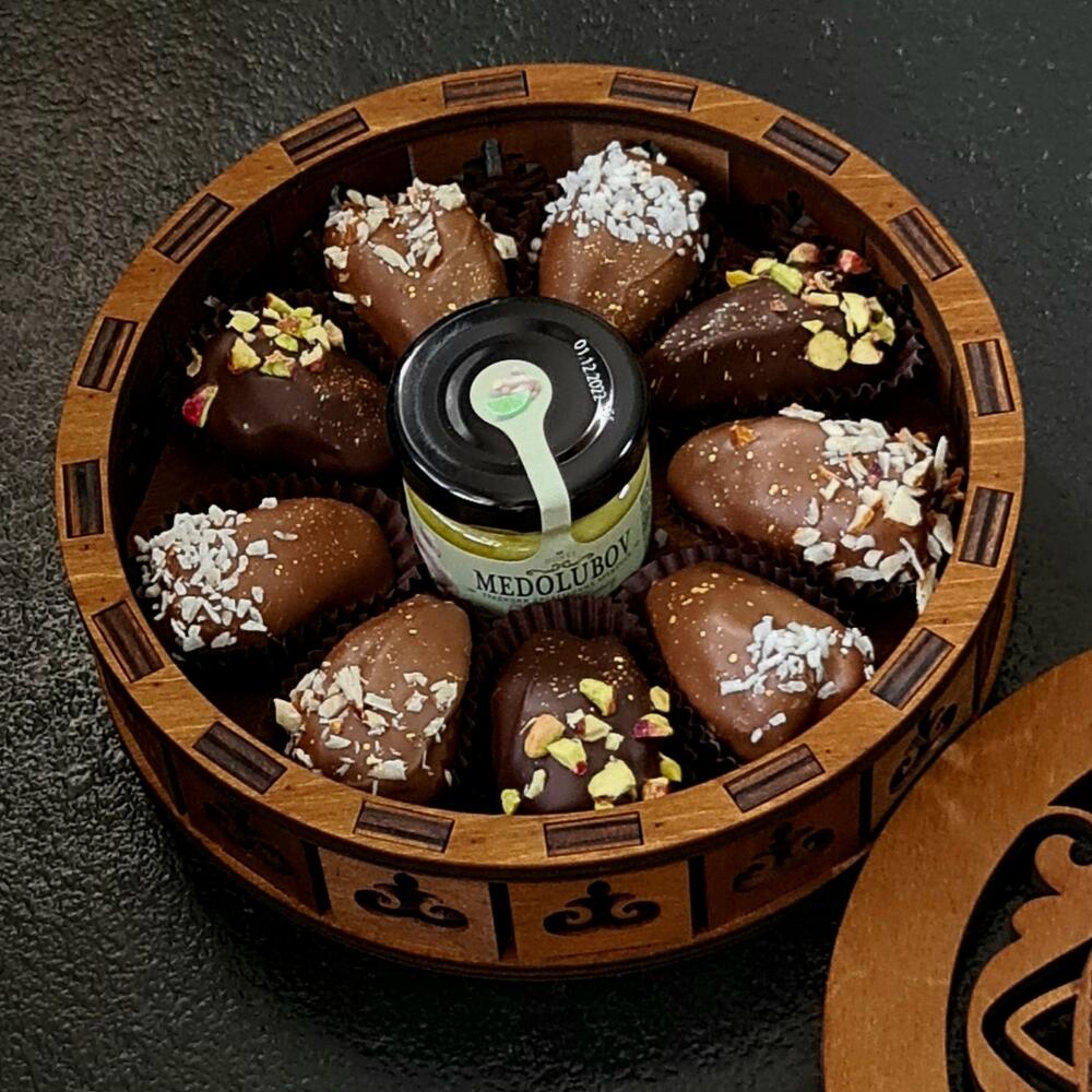 Финики в бельгийском шоколаде с грецким орехом внутри, сверху украшены дробленой фисташкой, миндалём и кокосовой стружкой. Центр украшает мёд-суфле .