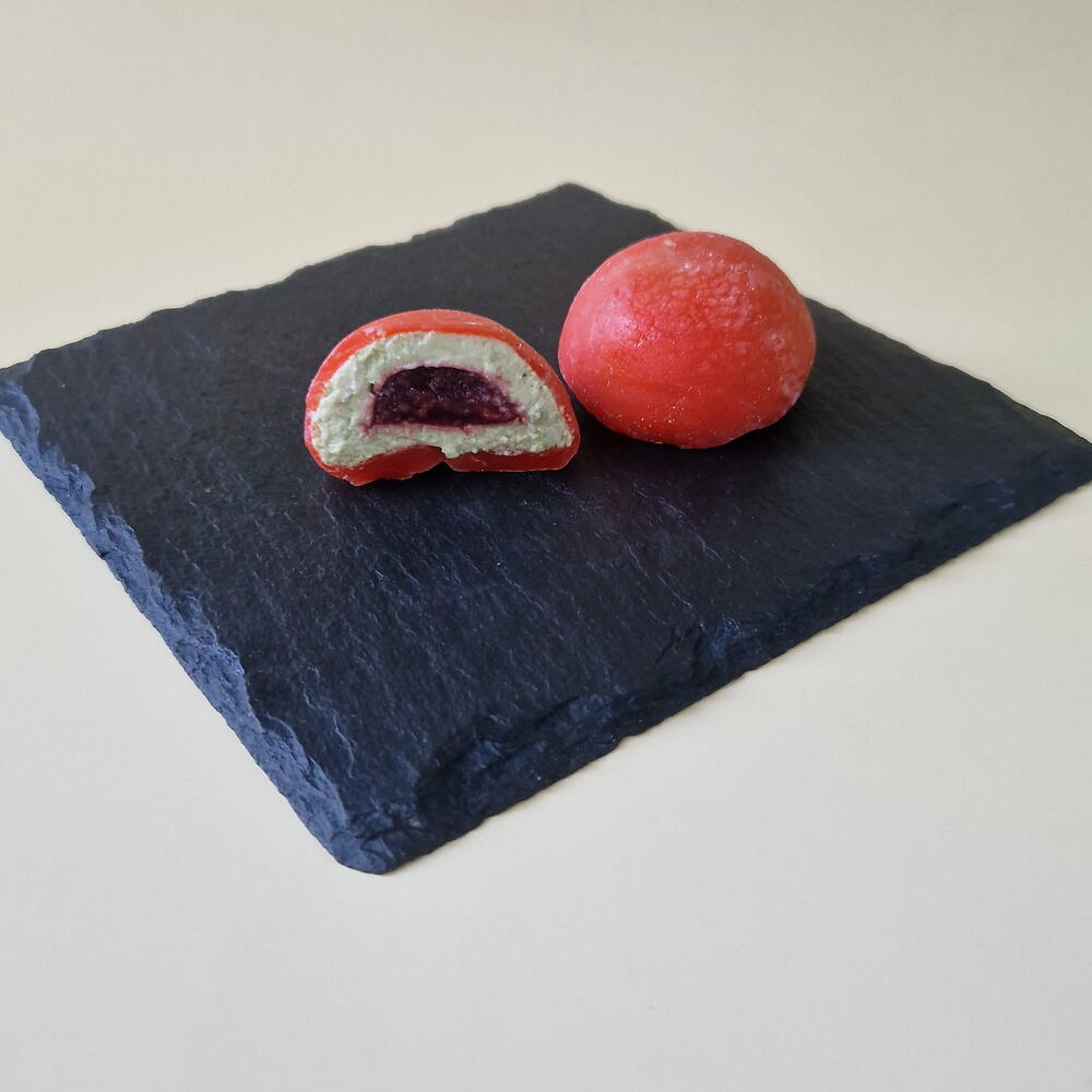 Вкусы: 1. Малина-фисташка 2. Клубника-мята 3. Смородина лимон 4. Лимон-кофе Состав: 1. Малина-фисташка: пюре малины, сыр маскарпоне, фисташковая паста, желатин, сливки, сахар, пектин, клейкая рисовая мука. 2. Клубника-мята: клубника, сок лайма, маскарпоне, сливки, шоколад белый, мята свежая, желатин, пектин, клейкая рисовая мука. 3. Смородина-лимон: смородина пюре, маскарпоне, лимон пюре, сливки, желатин, пектин nh, кукурузный крахмал, клейкая рисовая мука, сахар, масло подсолнечное, вода. 4. Лимон-кофе: пюре лимона, кофе растворимый, сливки, маскорпоне, пектин,желатин, рисовая мука, кукурузный крахмал, вода, масло подсолнечное.