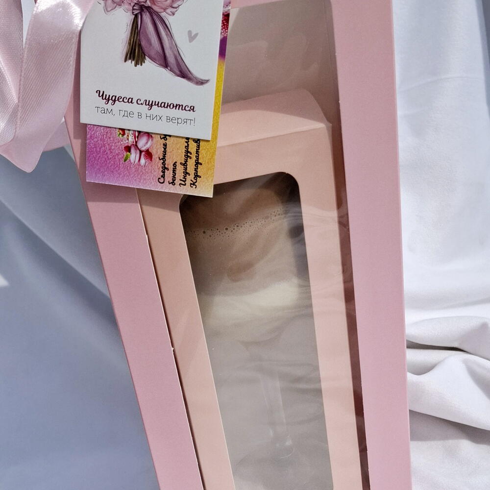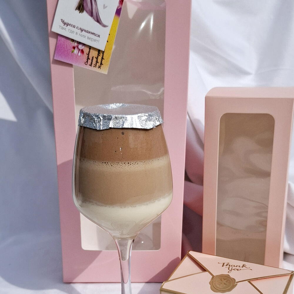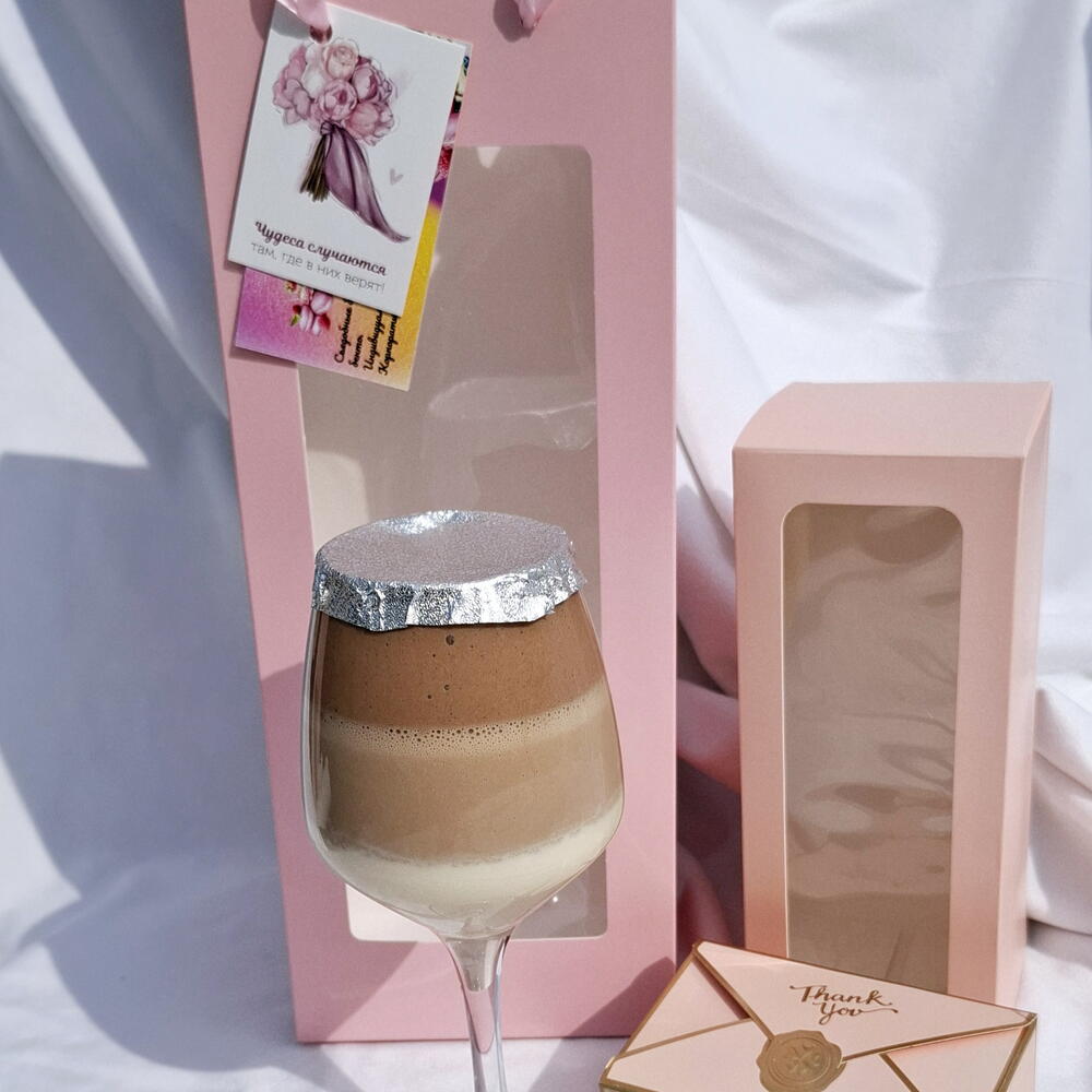 Вам надоел невкусный трайфл в одноразовый посуде? Тогда Вам к Нам. Предлагаем Вашему вниманию безумно нежный эстетически выдержанный в своей тематике трайфл в стеклянном фужере, который Вы в дальнейшем можете использовать в своих нуждах. Начинка: мусс 3 шоколада на основе натуральных сливок и качественного бельгийского шоколада. Нежность в Вашем бокале. В комплекте открытка, ложечка, спичка, чиркало, свечка. Такие подарки приятно дарить не только своим любимым, но и начальству.