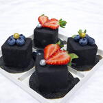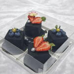 Муссовый десерт состоит из 4 пирожных в форме куба начинка ассорти: шоколадный, малиновый, манго, смородина.