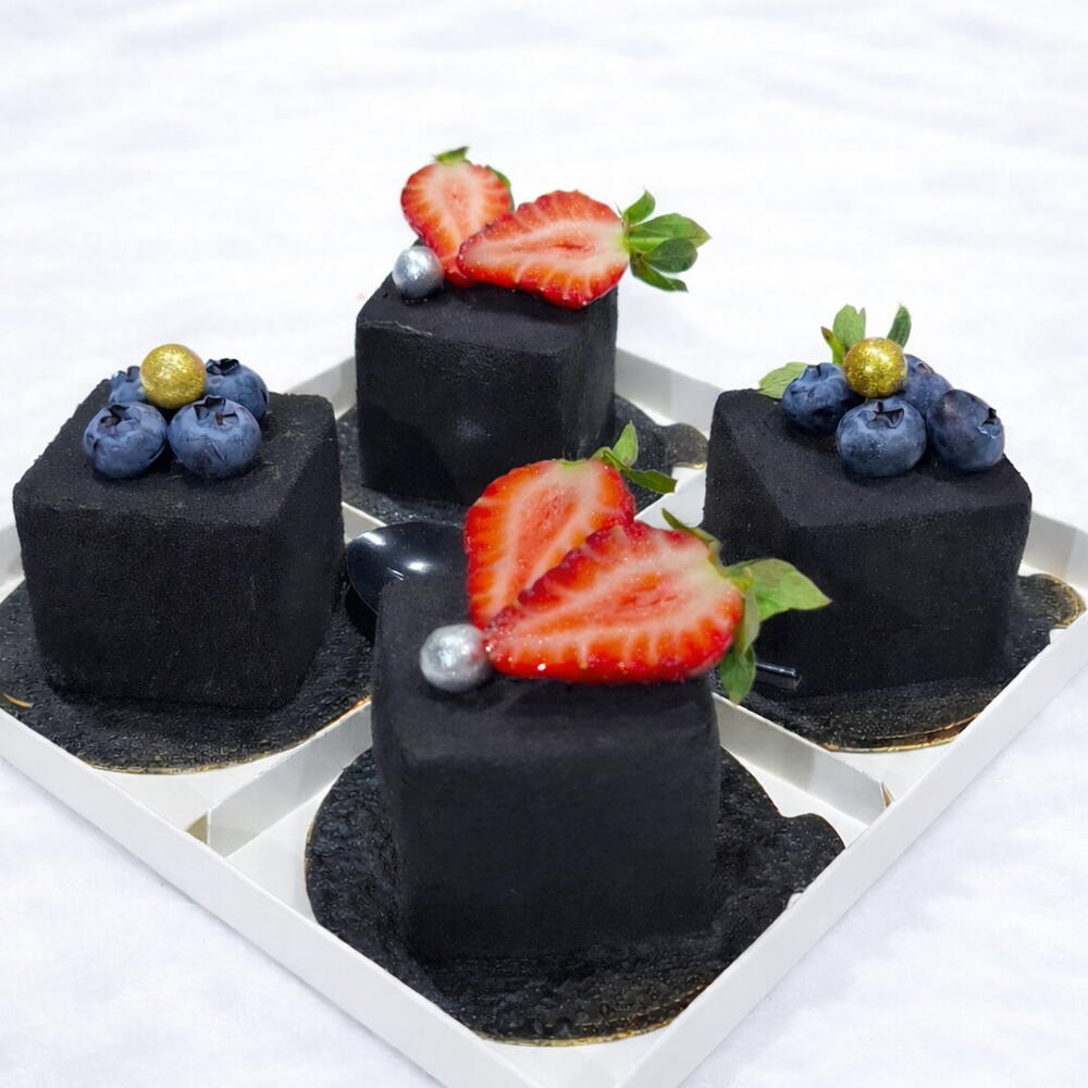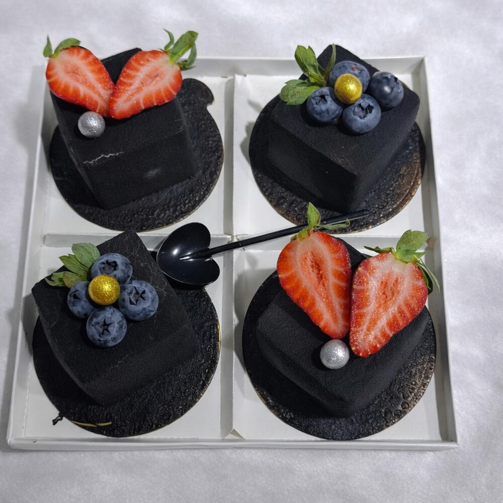 Муссовый десерт состоит из 4 пирожных в форме куба начинка ассорти: шоколадный, малиновый, манго, смородина.