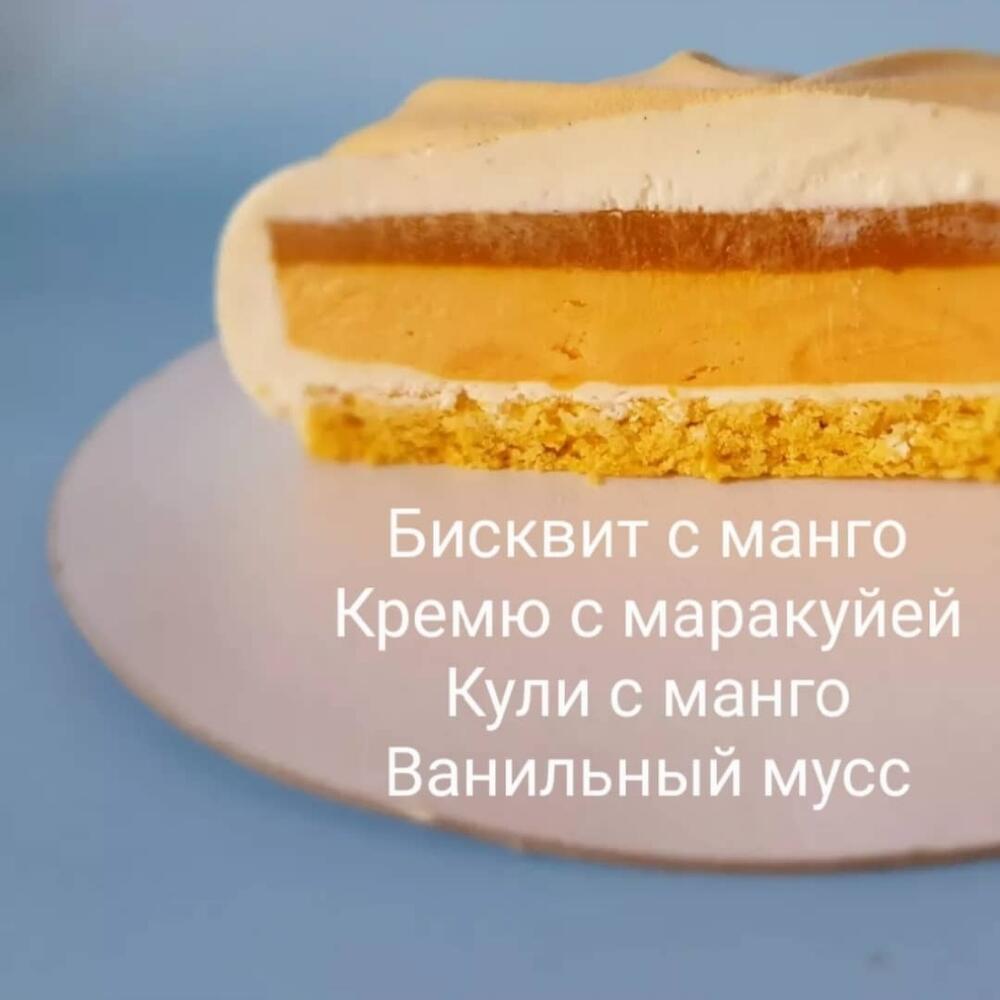 Пюре манго, пюре маракуйя, миндальная мука, рисовая мука, разрыхлитель, белый шоколад, яйца, семена ванили, сливки 33%, масло 82%.