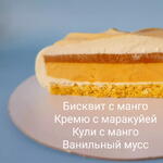 Манго пюре, маракуйя пюре, сливки 33%, масло 82%, мука, рисовая мука, белый бельгийский шоколад, яйца, миндальная мука, пектин, желатин халал, глюкозный сироп, сахар.