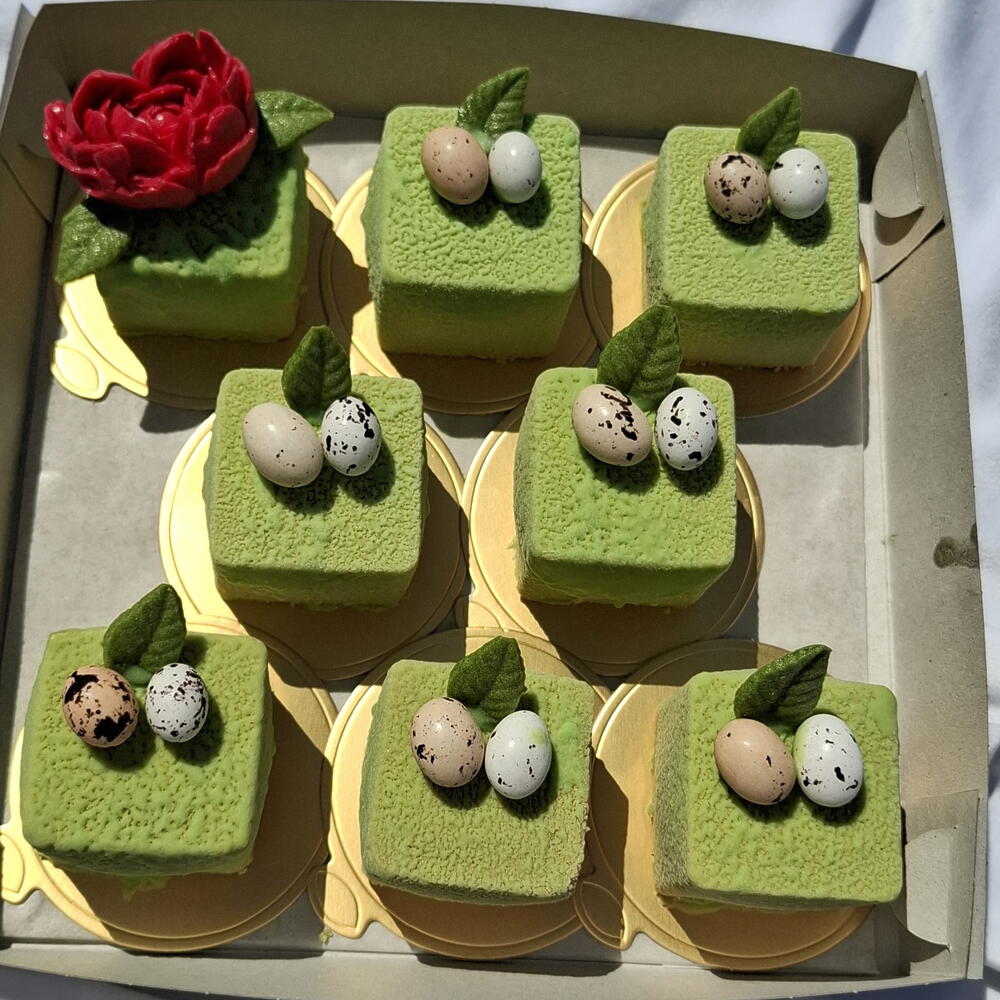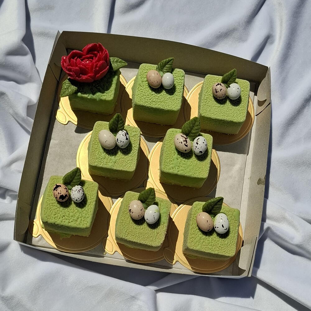 Набор муссовых пирожных с фундучным пролине покрытый велюром на белом шоколаде. Воздушный нежный десерт порадует Вас и тех кого Вы хотите ими угостить.