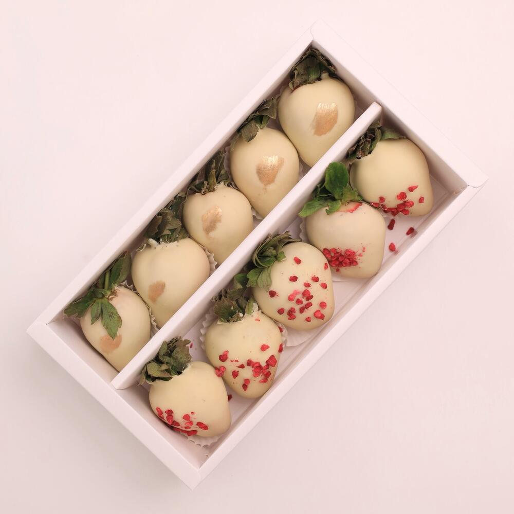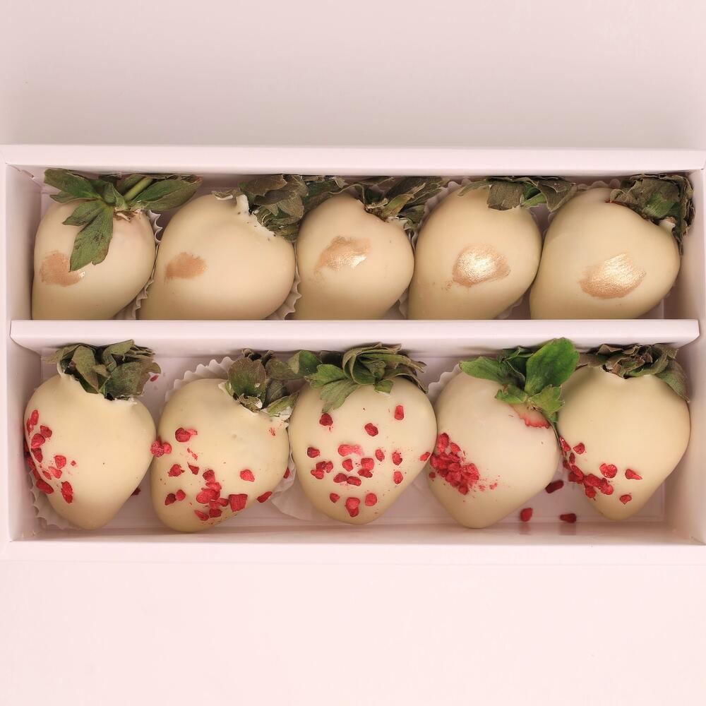 10 клубник в бельгийском белом шоколаде В дополнении используются посыпки: сублимированная малина кандурин Шоколад ручной работы 1 шт