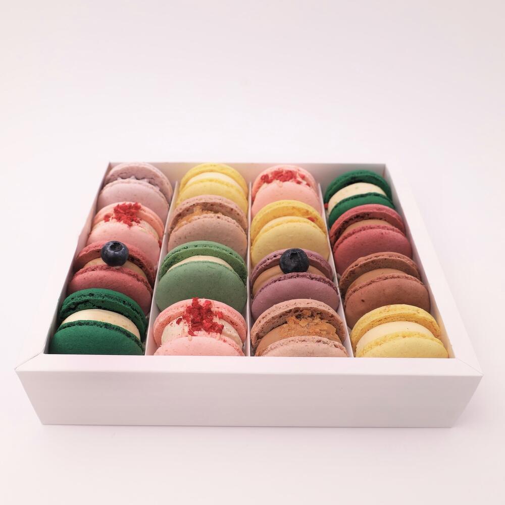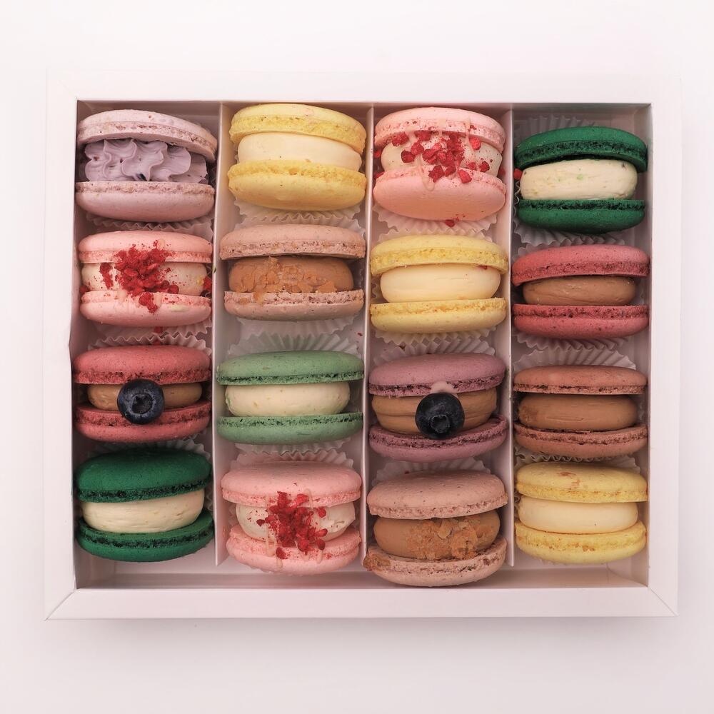 16 штук пирожных макарон ассорти с дополнением в виде 2-3 шт ягод свежей голубики и с сублимированной малиной 10 гр