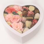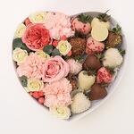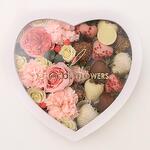 Цветы: Pink expression -1 , Pink Ohara -1, Dianthus-3, Bombastic-2, Eucalyptus , Gipericum-1 Клубника в белом, розовом и молочном шоколаде 8-11 шт В дополнении используются посыпки: сублимированная малина, кокосовая стружка, вафельные шарики