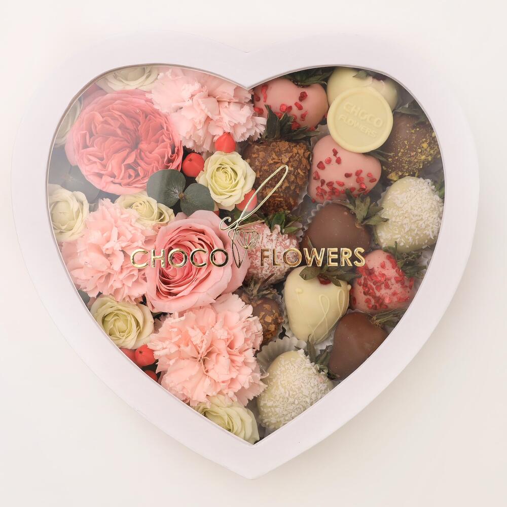 Цветы: Pink expression -1 , Pink Ohara -1, Dianthus-3, Bombastic-2, Eucalyptus , Gipericum-1 Клубника в белом, розовом и молочном шоколаде 8-11 шт В дополнении используются посыпки: сублимированная малина, кокосовая стружка, вафельные шарики