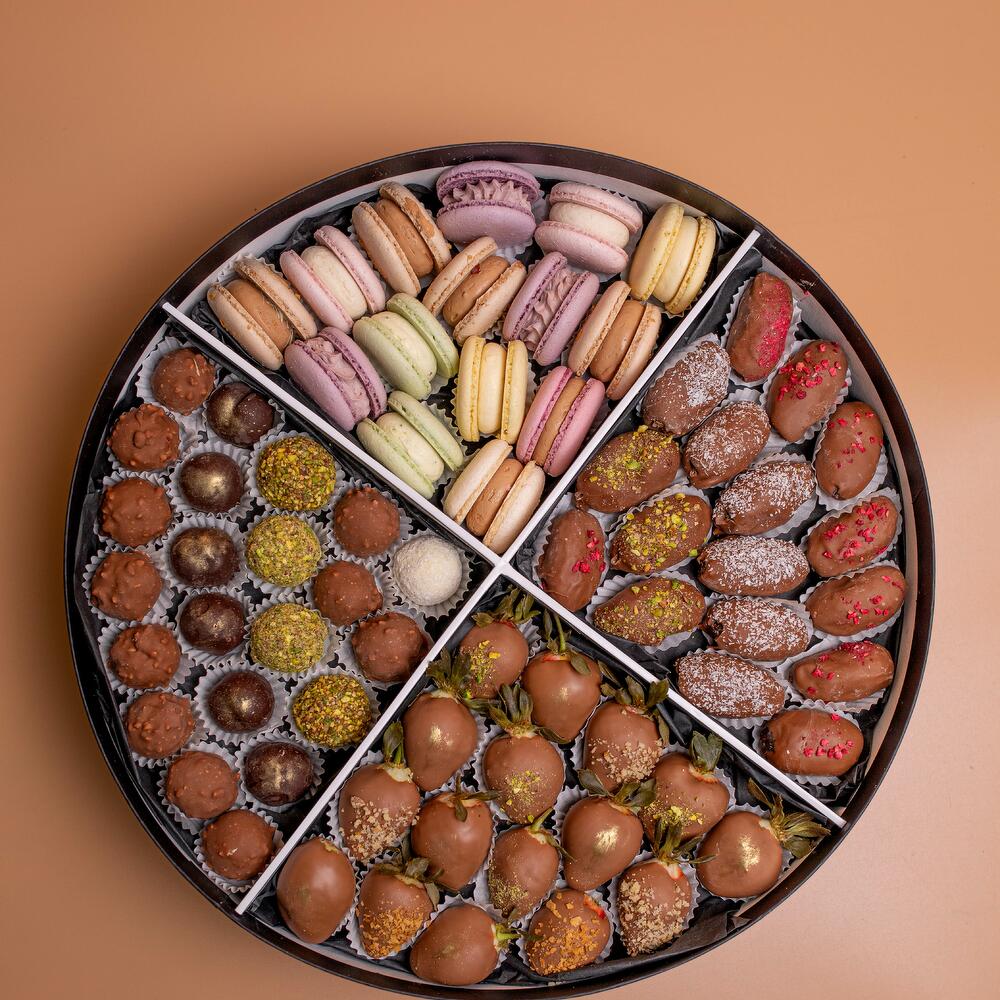 Клубника в молочном шоколаде 16 шт трюфели 22 шт финики в шоколаде 17 шт пирожные макарон 15 шт В дополнении используются посыпки: вафельная крошка, сублимированная малина, кокосовая стружка.