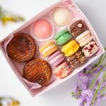 Макаронс- Минадальная мука, сливки натуральные, бельгийский шоколад, орехи и ягоды. Испанский чизкей- крем чиз, сливки, яйца, кукурузный крахмал. Моти - крем чиз, сливки, ягоды, фрукты.