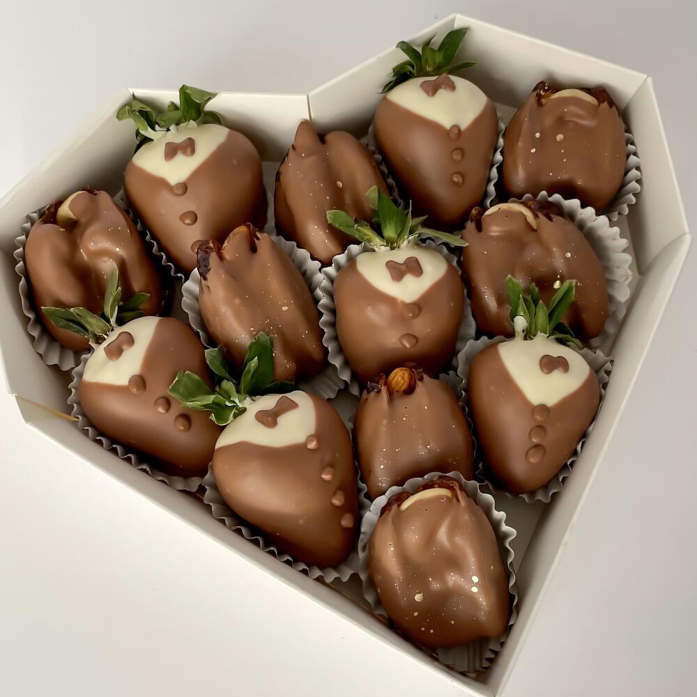 Свежая клубника 6-7 шт Королевские финики 6-7 шт Жареные орехи (грецкий, миндаль) Бельгийский шоколад Callebaut молочный (какао масло; сахар; молоко цельное сухое; эмульгатор соевый лецитин; какао тертое; ароматизатор натуральный ваниль), белый (сахар; молоко цельное сухое; эмульгатор соевый лецитин; ароматизатор натуральный ваниль) Упаковка: коробка подарочная, лента атласная, пакет.