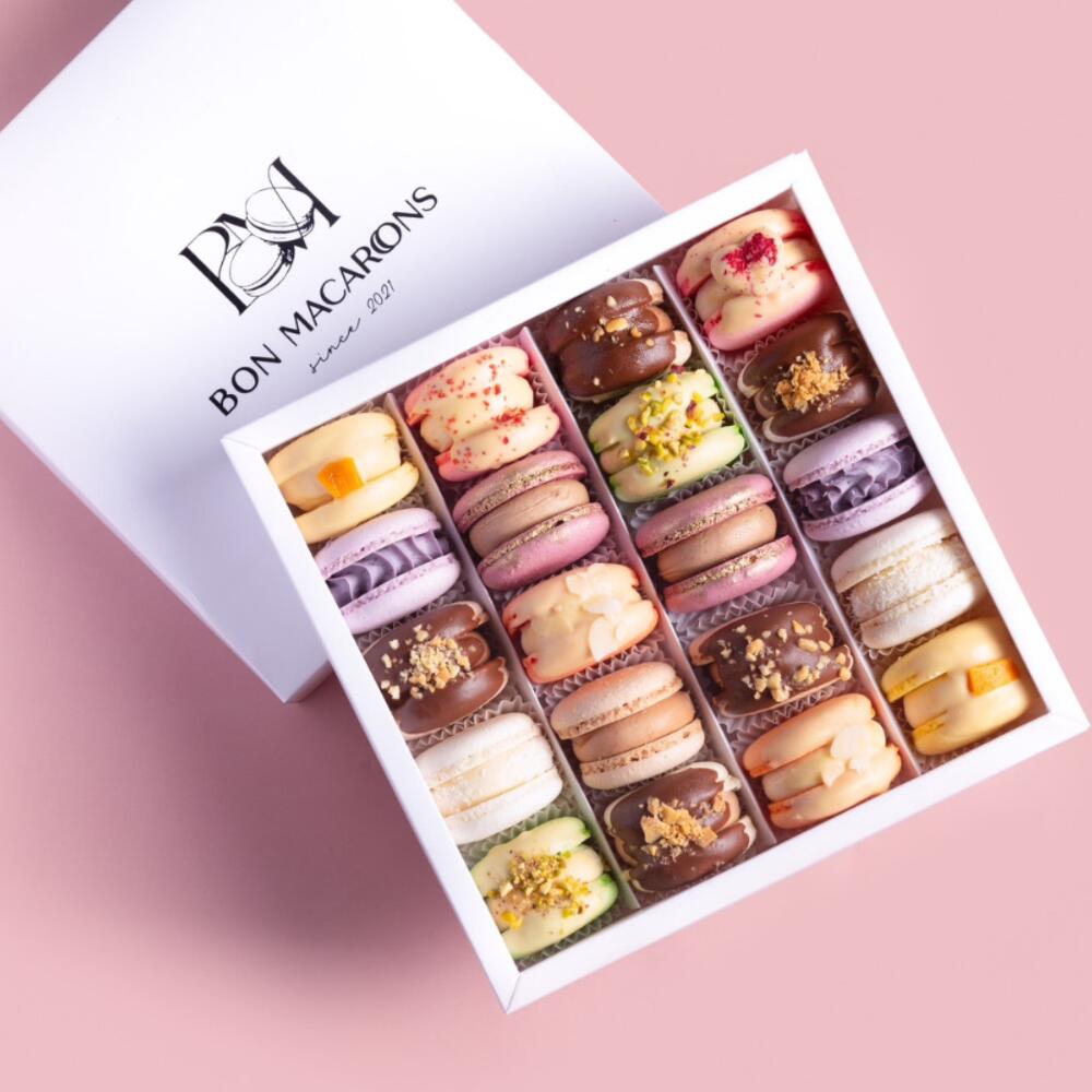 Набор из 20 шт макаронс, состав макаронс - миндальная мука, сливки натуральные, бельгийский шоколад, арахис, фисташка, малина.