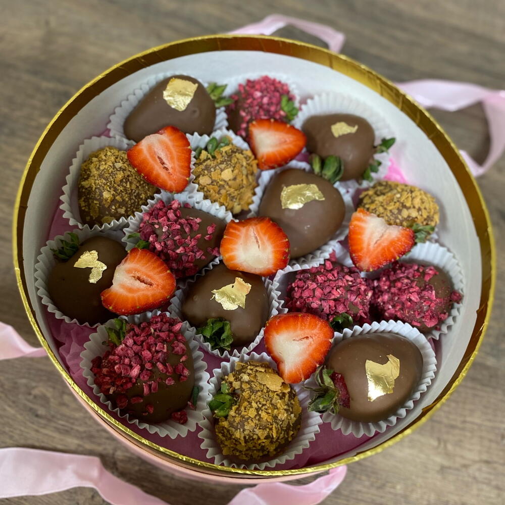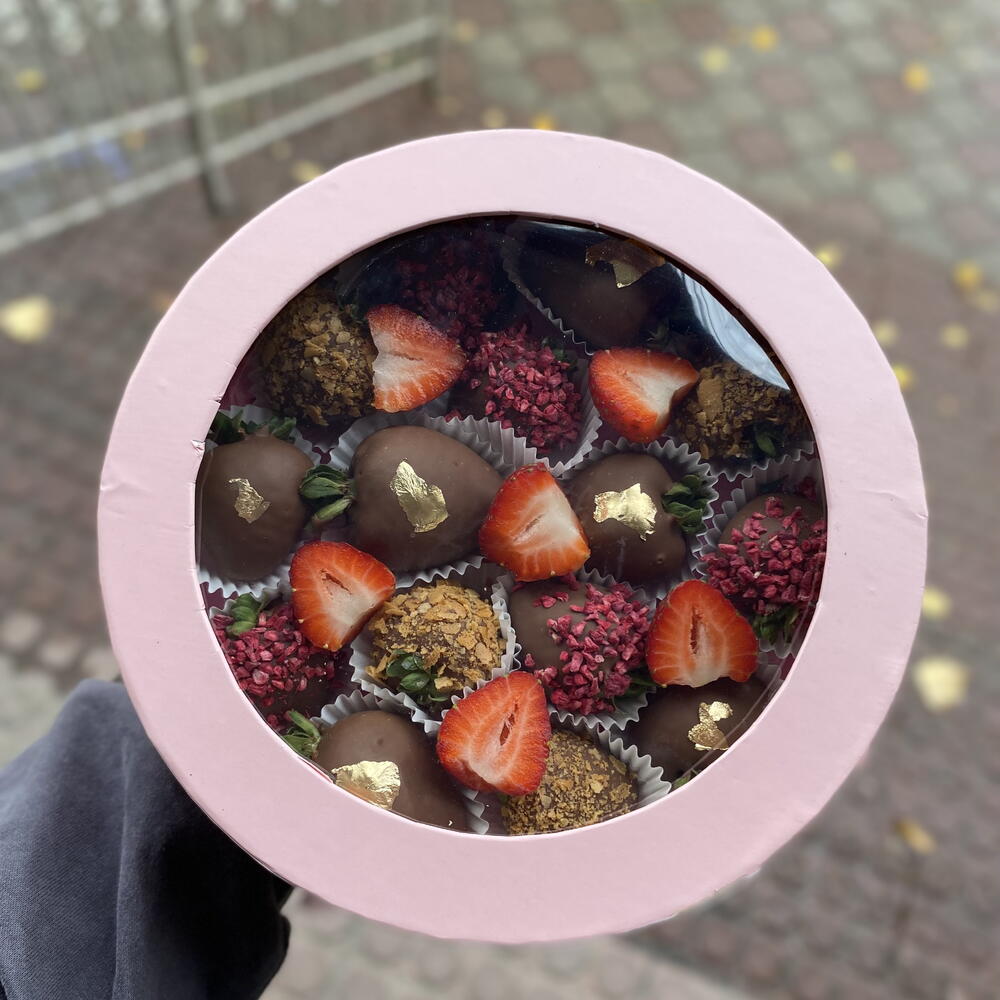 15 шт клубник в бельгийском шоколаде  Посыпки: вафельная крошка, сублимированная малина