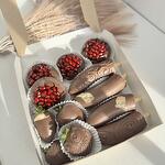 Бельгийский молочный шоколад, гранат - 4 шт (220 грамм) банан - 4 шт (220 грамм), клубника - 4 шт (160 грамм) Состав шоколада: какао-масло, тертое какао, сухое цельное молоко, сахар, натуральные лецитин и ваниль