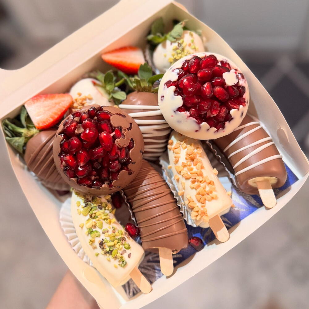 Состав:свежая клубника в бельгийском белом и молочном шоколаде - 4 шт свежие бананы в бельгийском белом и молочном шоколаде - 4 шт свежий гранат в бельгийском белом и молочном шоколаде - 2 шт Посыпка арахис фисташка Состав шоколада: какао-масло, тертое какао, сухое цельное молоко, сахар, натуральные лецитин и ваниль