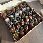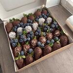 Состав:свежая клубника в бельгийском молочном шоколаде - 30 шт Свежая голубика 200 гр. Состав шоколада: какао-масло, тертое какао, сухое цельное молоко, сахар, натуральные лецитин и ваниль