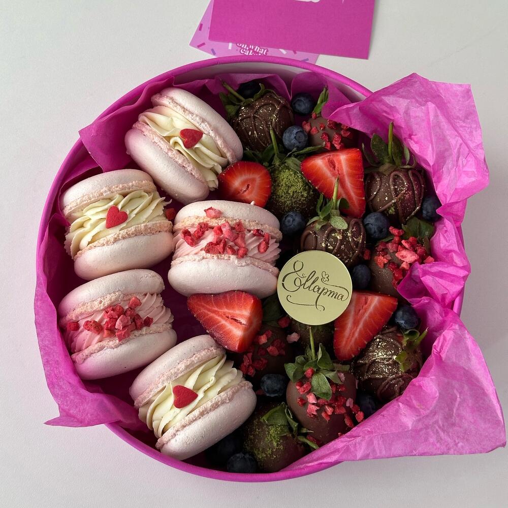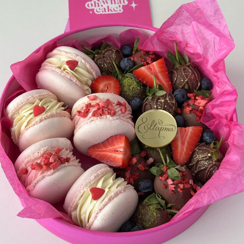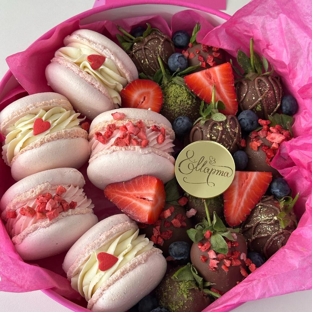 Подарок для ваших любимых🩷 В наборе 12 шт клубники в бельгийском шоколаде, макаронс (вкусы из наличия), топер золотой, праздничная упаковка✨ А так же открытку вкладываем и подписываем по желанию 💌 Для уточнения деталей, просто напишите нам в чат♥️